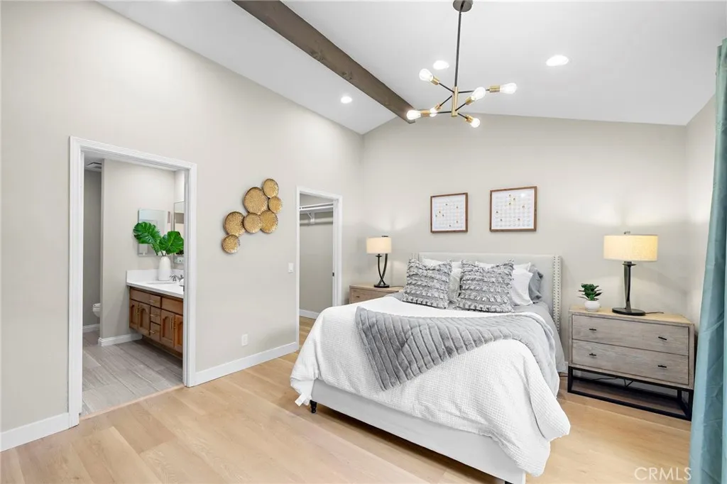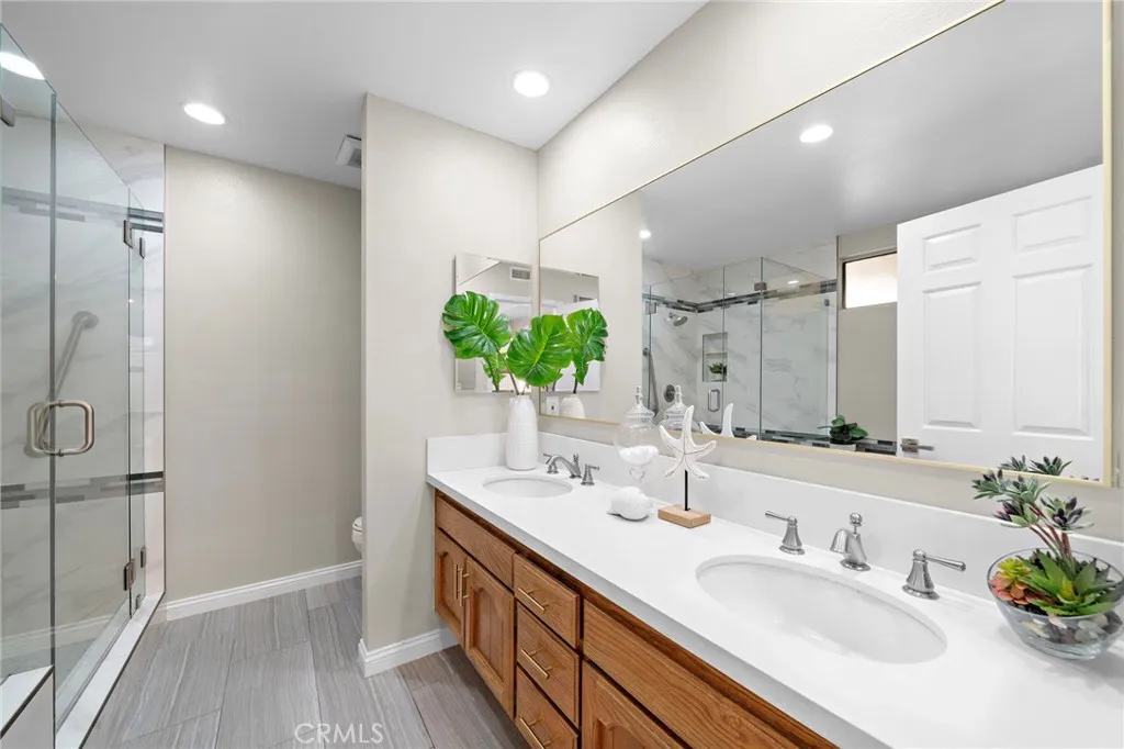 Located in the exclusive Kingsbriar enclavean intimate community of only 22 quality-built Warmington Homesthis exceptional Fountain Valley townhome is truly one of the most beautiful you will ever see, offering the look and feel of a full single-family residence. This highly upgraded 3-bedroom, 2-bath home spans 1,566 square feet and welcomes you through a charming covered, gated courtyard with direct access to the attached two-car garage. Inside, soaring ceilings, extensive recessed lighting, raised-panel interior doors, central A/C, and wide-plank wood-style vinyl flooring (tile flooring in kitchen and baths) create a light, open, and refined ambiance. The stunning, massive remodeled kitchen is the heart of the home, featuring a center island with seating and chic pendant lighting, granite countertops, coffered ceiling with recessed lights, open designer shelving, deep stainless sinks, gas range with vent hood, dishwasher, abundant custom cabinetry, and a sunny eat-in breakfast nook. The expansive living room includes a fireplace, ceiling fan, and a spacious formal dining area, all seamlessly open to the kitchen in a true great-room design, with sliders leading to both a private atrium patio and a generous backyard complete with patio, garden areas, and block wall fencing. Double entry doors open to the luxurious primary suite that offers room for a sitting area, a walk-in closet, cathedral ceiling, and sliding doors to the atrium patio, along with a spa-style remodeled bath showcasing quartz countertops, dual sinks, a soaking tub, and a separate shower with marble-style