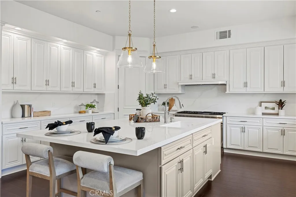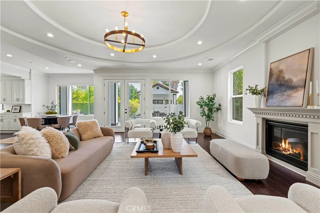 Tucked away at the end of a private cul-de-sac, this French Chateau inspired trophy estate offers timeless elegance, grand scale, and a rare detached ADU guest house. A dramatic double height foyer sets the tone, highlighted by a sweeping wraparound staircase and striking custom chandelier. The formal living room impresses with soaring ceilings, a statement fireplace, and towering bay windows that fill the space with natural light. Designed for both everyday living and entertaining, the chefs kitchen features custom cabinetry, a generous center island, high end stainless steel appliances, and an expansive walk in pantry. The kitchen opens seamlessly to the family room with fireplace and French doors, creating exceptional indoor outdoor flow. All five bedrooms are oversized, each offering ensuite bathrooms and walk in closets. The romantic primary suite is a true retreat, complete with a private foyer, sitting room, dual walk in closets, a spa inspired bath with custom shower and soaking tub, and a private balcony. The entertainers backyard provides a resort style setting with pool, spa, covered patio, and low maintenance turf, ideal for gatherings or quiet relaxation. The detached guest house includes a spacious living area, full kitchen and bath, and a large bedroom, perfect for guests, multigenerational living, or additional income potential. An extraordinary custom estate that blends sophistication, comfort, and versatility. This is a must see home.
