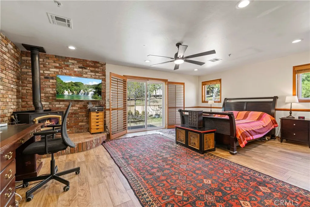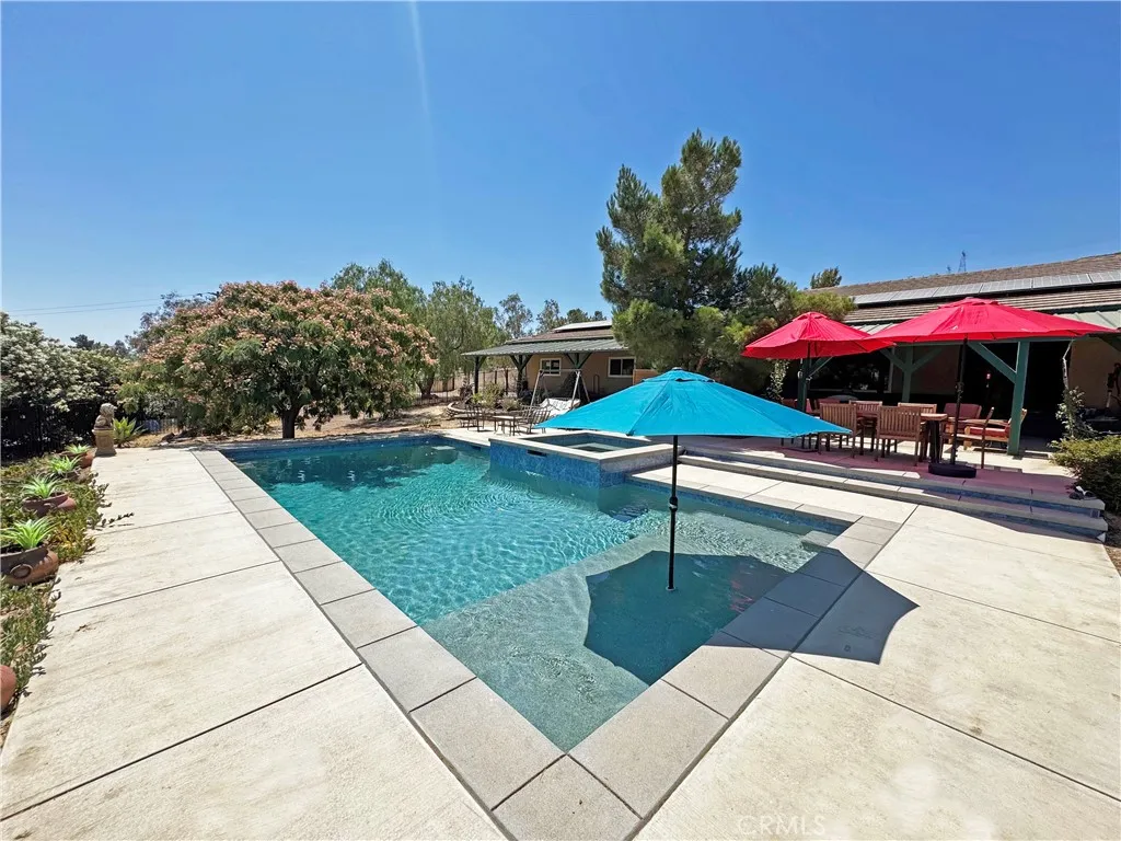 An equestrian familys dream property. Set on over five acres, this single-story ranch offers country living with modern convenience. Featuring a large open arena, 4 stall barn with tack room, a separate pen with shelter, a tree-lined round pen, a large dry lot paddock, and a huge open arena with a tree-covered cooling-off walk around it. With direct access to riding trails from both the front and back gates, its an ideal setup for equestrian living. In addition, there is a hay shed, chicken coop with run, goat/chicken pens, and a large tool shed. The 4- bedroom home boasts a new Pebble Tec pool and spa, built in 2023, providing the perfect place to relax while enjoying the peaceful surroundings and spectacular sunsets. A wall of Oleander trees creates complete privacy from neighbors. Paid solar, and 2 Tesla Power walls mean youre never without power. Other features include a cottage library with built-in shelves, offering incredible potential as a private retreat, office, or future ADU. Inside, the home features two fireplaces, and a spacious layout. Recent upgrades include a newer instant hot water tank for the bathrooms, a newer dishwasher, and a newer water purifier in the garage. The garage is finished with laminate flooring, ample storage, and an outlet for electric/hybrid vehicle charging. An electric gate completes the fully enclosed property, adding to its functionality. With flat acreage, well-planned equestrian facilities, this is a rare opportunity to enjoy spacious country living with all the conveniences of a well-maintained home.
