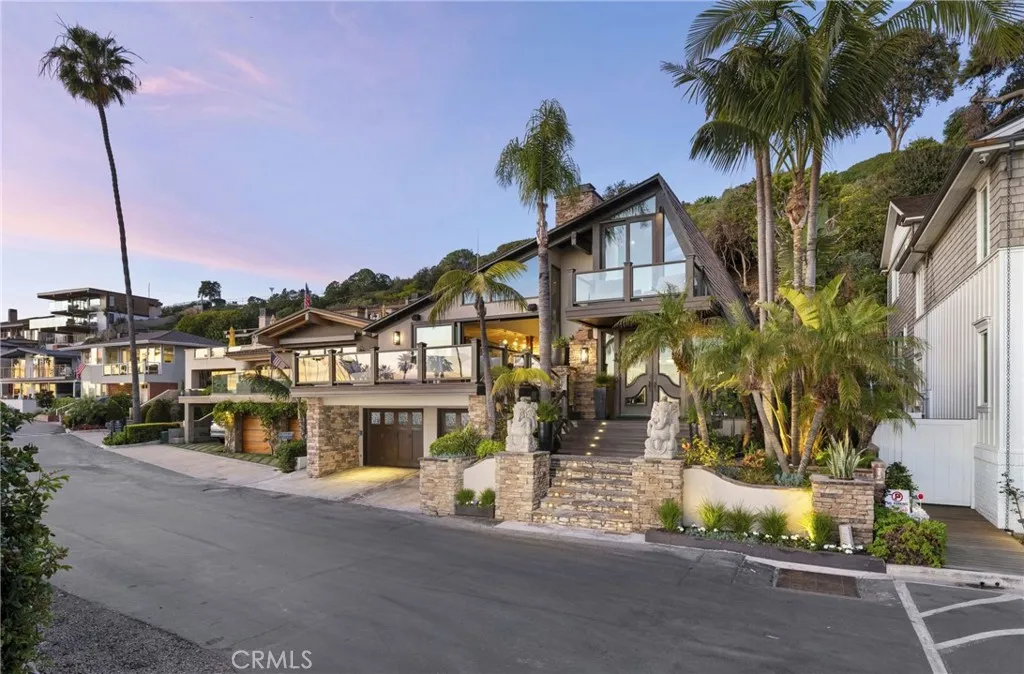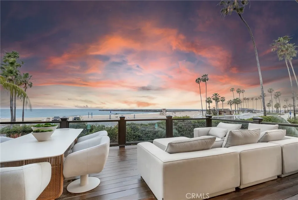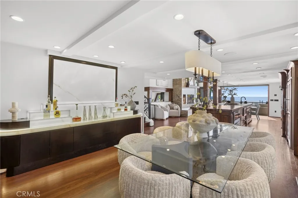 Set at the end of Breakers Drive, this extraordinary beachfront estate claims one of the most breathtaking vantage points along the coast, where endless ocean views, golden-hour sunsets, and the sound of the surf define daily life. Positioned just beyond the gates of one of the areas most coveted beachfront enclaves, the home offers a rare combination of privacy, direct beach access, and a front-row seat to the Pacific. Featuring four bedrooms plus bonus room, including a main-level en-suite, five bathrooms, and multiple ocean-facing decks designed to maximize both the scenery and the coastal lifestyle. Newly refinished wood floors and decks enhance the homes fresh, coastal feel, while expansive glass and intentional sightlines create seamless transitions between indoor and outdoor living. The ocean-view living room is a true retreat, centered by a wood-burning fireplace and appointed with custom cabinetry, a motorized lift housing dual televisions for versatile viewing, and reflective detailing that elevates both light and function. The kitchen blends warmth and character with professional-grade performance, showcasing Viking appliances, a farmhouse sink, a secondary utility sink, generous wood and honed stone surfaces for texture and refinement, and an alcove that artfully frames the eight-burner range, dual ovens, and pot filler. Distinctive designer lighting accentuates the craftsmanship throughout and extends into the adjoining dining room, where a temperature-controlled walk-in wine cellar and an illuminated onyx bar create a dramatic, gallery-like focal point. Both s