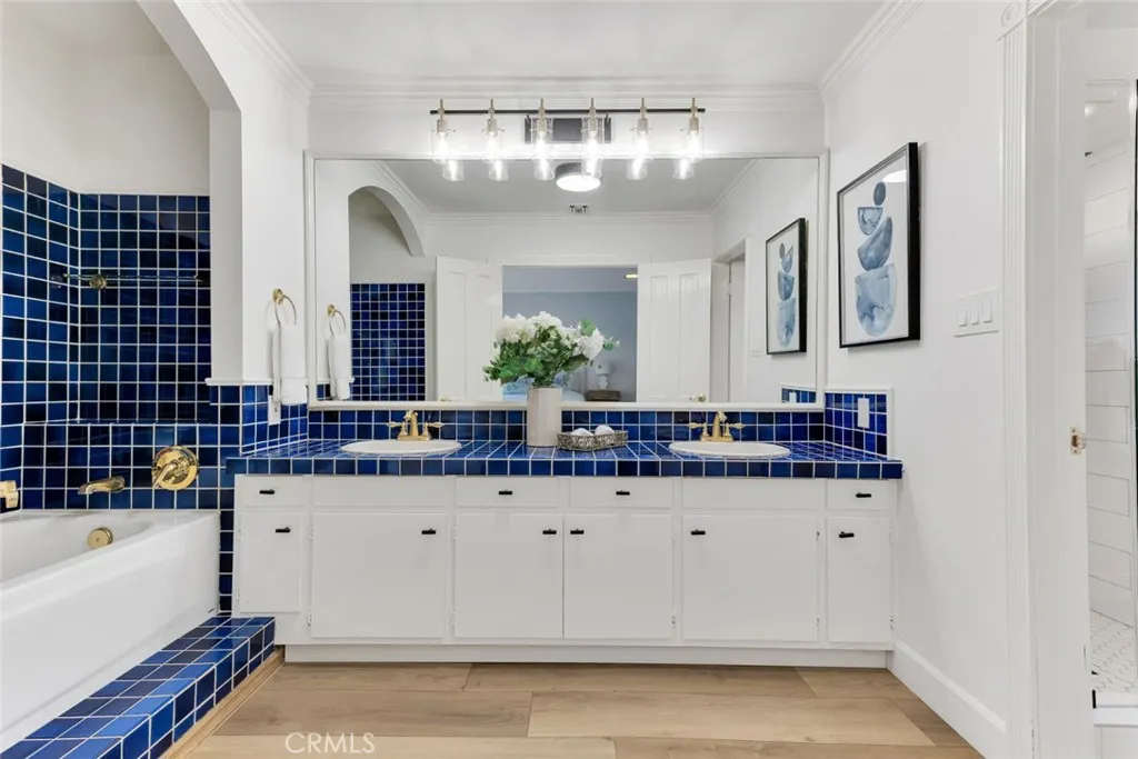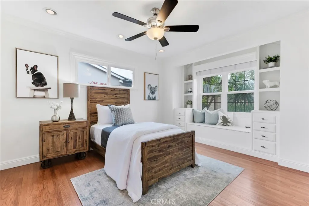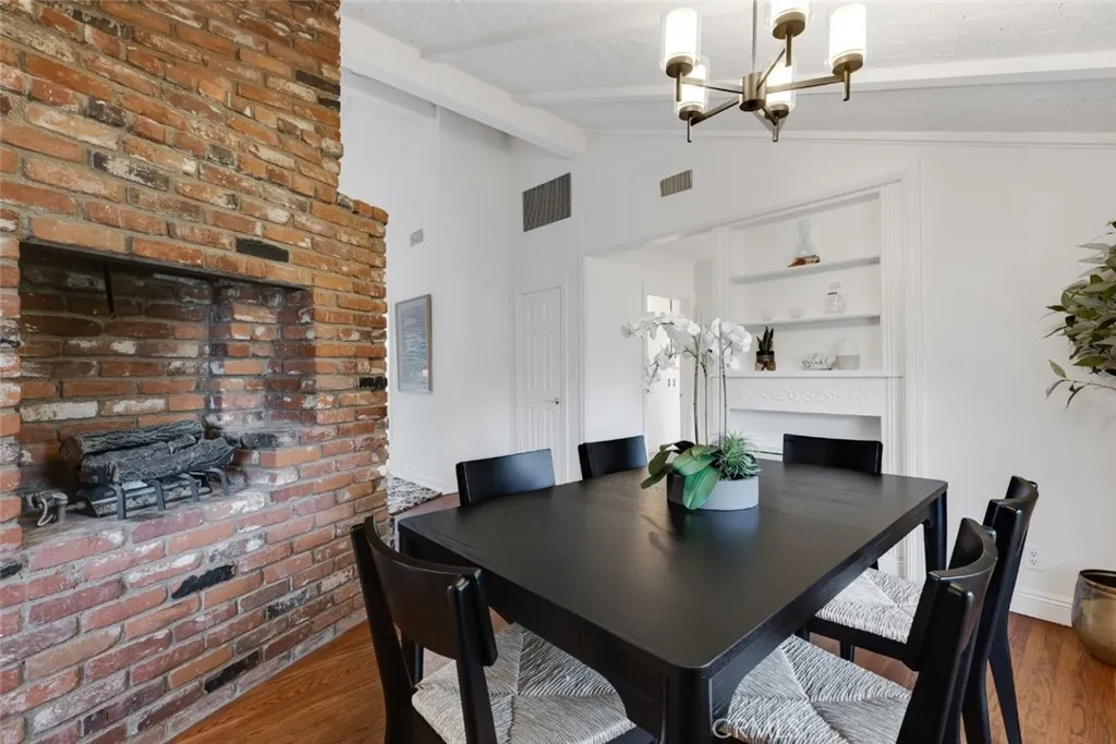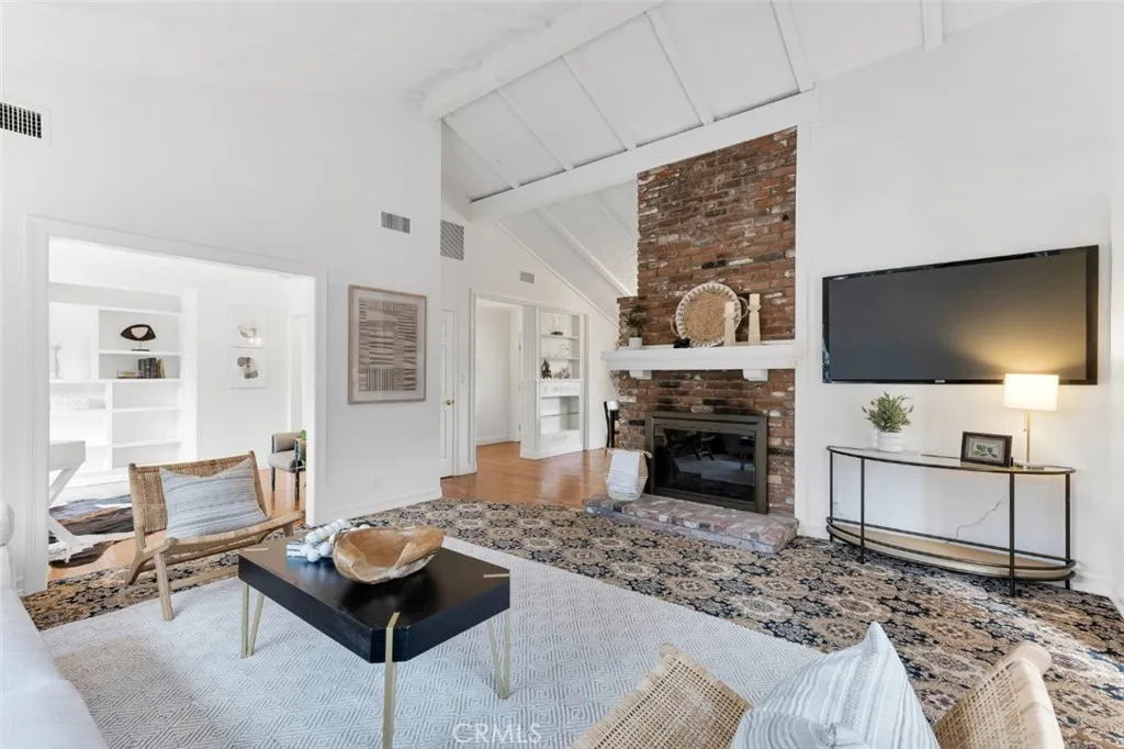 Spacious & versatile 4 bed, 2 bath, ranch-style home on expansive, privately gated 15,000+ sq ft lot in coveted Sherwood Forest neighborhood of Northridge. Set back from the street, the fully-gated estate ensures privacy & offers wonderful outdoor space with hexagon paver driveway framed by planters, decorative walkways & drought conscious landscaping offsetting a charming faade of wood siding, brick wainscoting, white trim & shutters for timeless appeal. The front could easily be converted into a convenient circular driveway. Inside, the home displays classic aesthetic touches like hardwood floors, crown molding & decorative wainscoting which blend beautifully with soaring vaulted ceilings and exposed beams in the living & dining rooms, anchored by a striking double-sided brick fireplace & custom built-ins that add warmth and architectural character. The vaulted kitchen is both functional and inviting, featuring a butcher block center island, oak cabinetry, decorative brick accent wall, a sunny greenhouse window & cozy breakfast nook. French doors open to back patio, enhancing indoor-outdoor flow. A spacious step-down addition with vaulted ceilings & French doors to the patio serves as a generous, private primary suite with luxury vinyl flooring, both a mirrored and walk-in closet with cedar paneling & floor, en suite full bath with dual sink vanity, separate soaking tub & updated walk-in shower. The space can also serve as a home theater, rec room, gym, or private office, allowing exceptional versatility & functionality. Three additional large bedrooms on the other side o