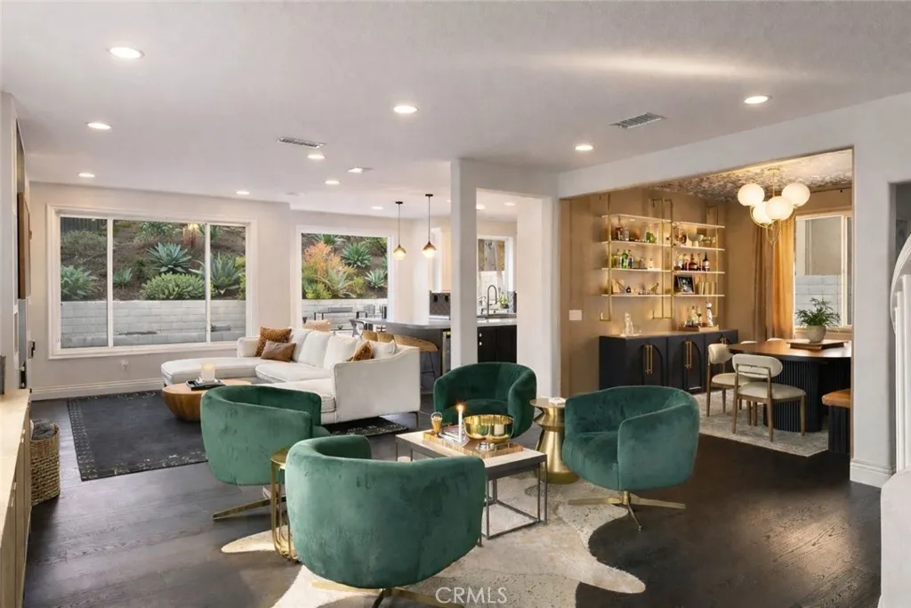 Thoughtfully upgraded with designer details at every turn, this extensively improved home offers a rare opportunity to enjoy a fully updated residence in guard-gated San Joaquin Hills. From the moment you step inside, the living room creates an inviting first impression. The space flows seamlessly into the family room in a beautifully open layout enhanced by the removal of the wall between the living and family rooms. Custom built-in cabinetry and a fireplace with designer tile create a warm and comfortable setting for everyday living. Just beyond, the dining room becomes a statement space with designer wallpaper, a Mitzi chandelier, and a custom built-in dining bench designed for intimate meals and memorable gatherings. The chefs kitchen serves as the heart of the home, showcasing Carrara marble countertops, an Italian glass tile backsplash, white Shaker cabinetry, a 6-burner Wolf range, Viking hood with heat lamps, double ovens, Bosch dishwasher, wine refrigerator, and a stainless steel farmhouse sink with reverse osmosis filtration. French doors extend the living experience outdoors to a thoughtfully designed backyard with designer tile hardscape, artificial turf, and a modular BBQ station ideal for year-round entertaining. The main level features a flexible bedroom with a built-in Murphy bed and an updated Carrara marble bathroom, ideal for guests, multigenerational living, or a private office. Upstairs, the loft addition offers versatility and may serve as a sixth bedroom, providing a private retreat with iron and glass doors, custom media cabinetry, and a built-in wor