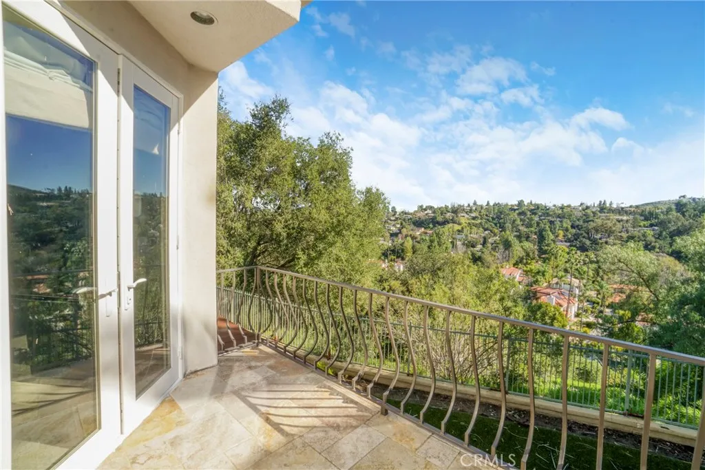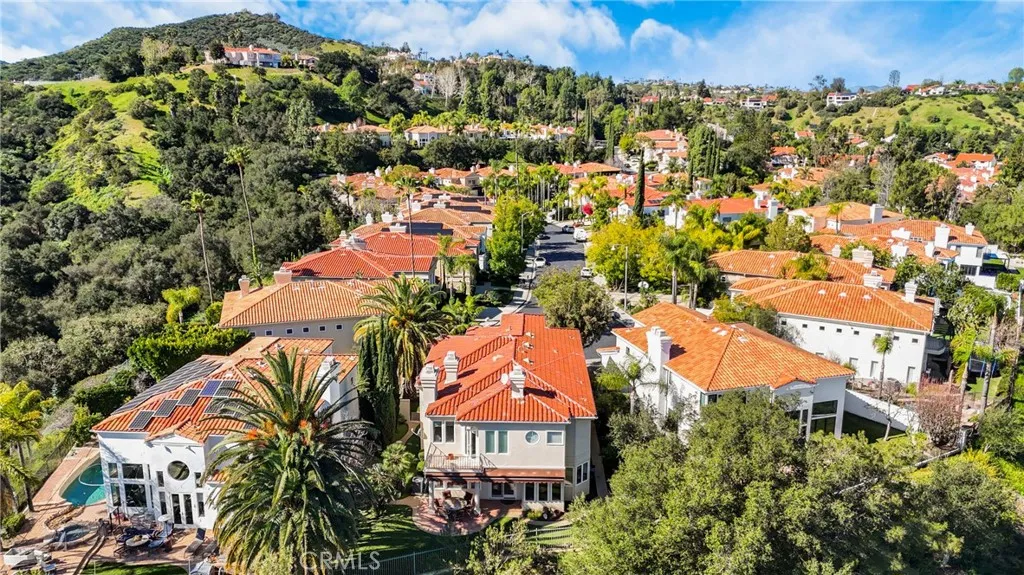 Located within the prestigious guard-gated Bellagio community, this Mediterranean-style residence captures beautiful hillside and treetop views that enhance both privacy and ambiance, creating a true sense of retreat. Thoughtfully positioned to take advantage of its scenic surroundings, the home offers approximately 3,788 sq ft of living space on a 7,343 sq ft lot, with four bedrooms and five bathrooms, highlighted by an elevator providing convenient multi-level access. The light-filled interior showcases soaring two-story ceilings, expansive windows, and an open yet functional floor plan designed for comfortable living and entertaining. The kitchen features generous cabinetry, center island, and a sunlit breakfast nook overlooking the greenery beyond, flowing seamlessly into the main living areas. Formal and casual spaces are both warm and inviting, complemented by fireplaces and timeless architectural details. The primary suite serves as a private sanctuary, complete with its own fireplace, balcony, and tranquil hillside outlooks. Secondary bedrooms are well-sized and versatile for guests, office, or lifestyle needs. Outdoor spaces embrace California living with lush landscaping, patio areas for dining and lounging, and peaceful views that provide a rare sense of serenity within a community setting. The yard offers both usability and privacy, ideal for relaxing or entertaining. Additional highlights include a dedicated laundry room, ample storage, and a three-car garage. Residents of Bellagio enjoy security, pride of ownership, and close proximity to shopping, dining, and