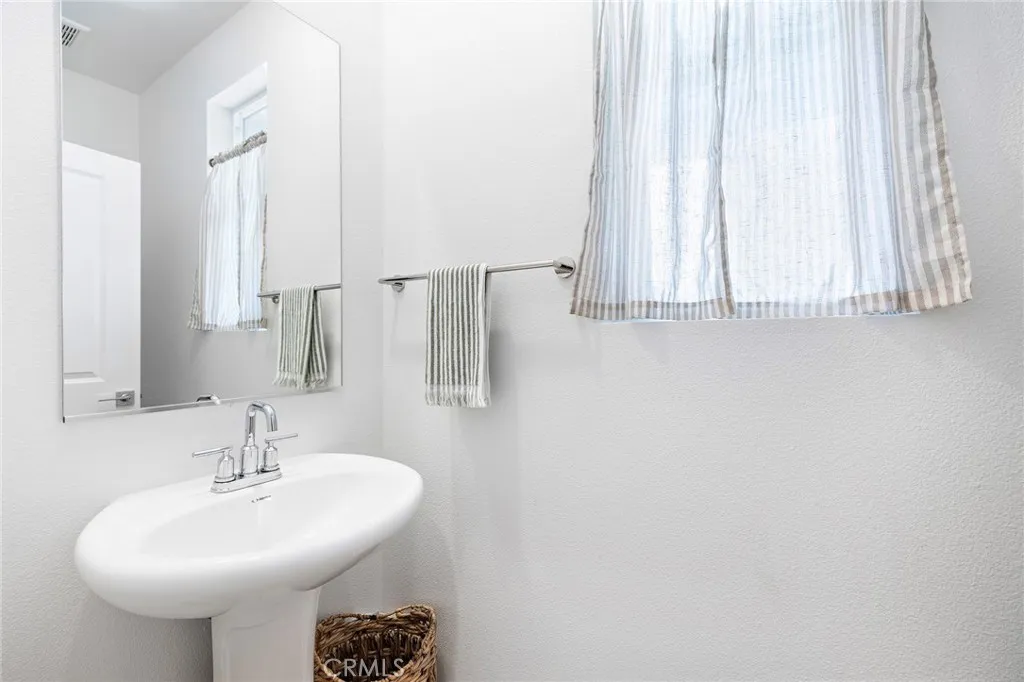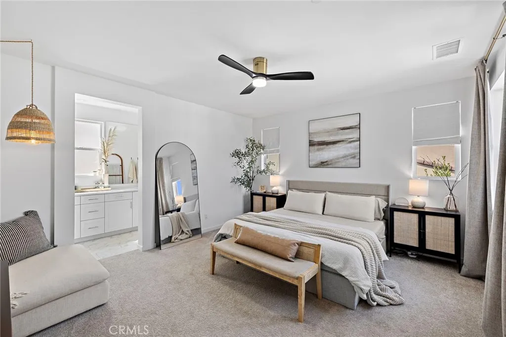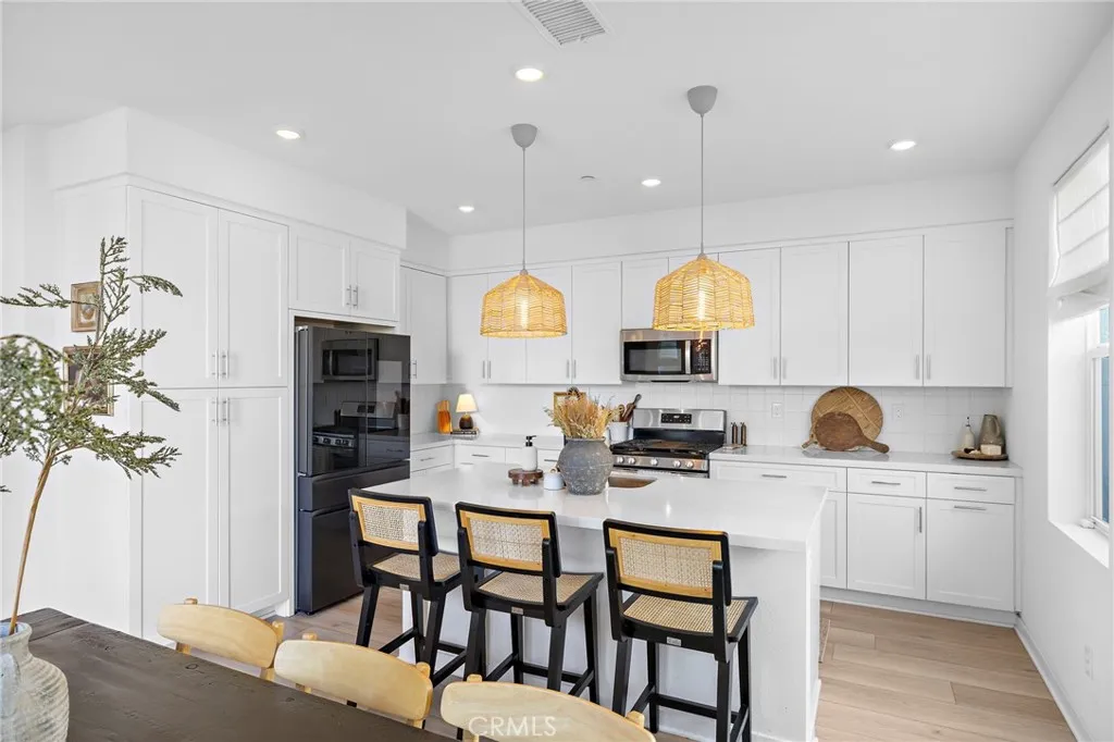 This stunning detached home with solar panels is located in the gated Bedford community offering 3 bedrooms plus a versatile loft. Designed with an open-concept layout, the home features luxury vinyl plank flooring, modern white cabinetry, and quartz countertops throughout. The spacious living room is filled with natural light from surrounding windows and flows seamlessly into the kitchen, which offers ample storage, stainless steel appliances, and a large Quartz island with sink and seating that opens to the dining area and overlooks the backyard. Upstairs, a centrally located loft sits between all bedroomsperfect for a family room, game room, or study. The expansive primary suite features a comfortable seating area, walk-in closet, and an en-suite bathroom with tile flooring, dual vanity, and a large glass-enclosed shower. A convenient upstairs laundry room completes the second level. The thoughtfully designed backyard offers a balanced blend of hardscape and green space, creating a functional and inviting outdoor setting. This turnkey home showcases Mediterranean-inspired architecture paired with modern finishes and energy efficiency. Residents enjoy resort-style community amenities including a pool, spa, fitness center, clubhouse, dog park, scenic walking trails, and playgrounds. Ideally located near shopping, schools, and the 15 freeway, and backing to Eagle Glen Golf Course, this home offers both comfort and convenience.