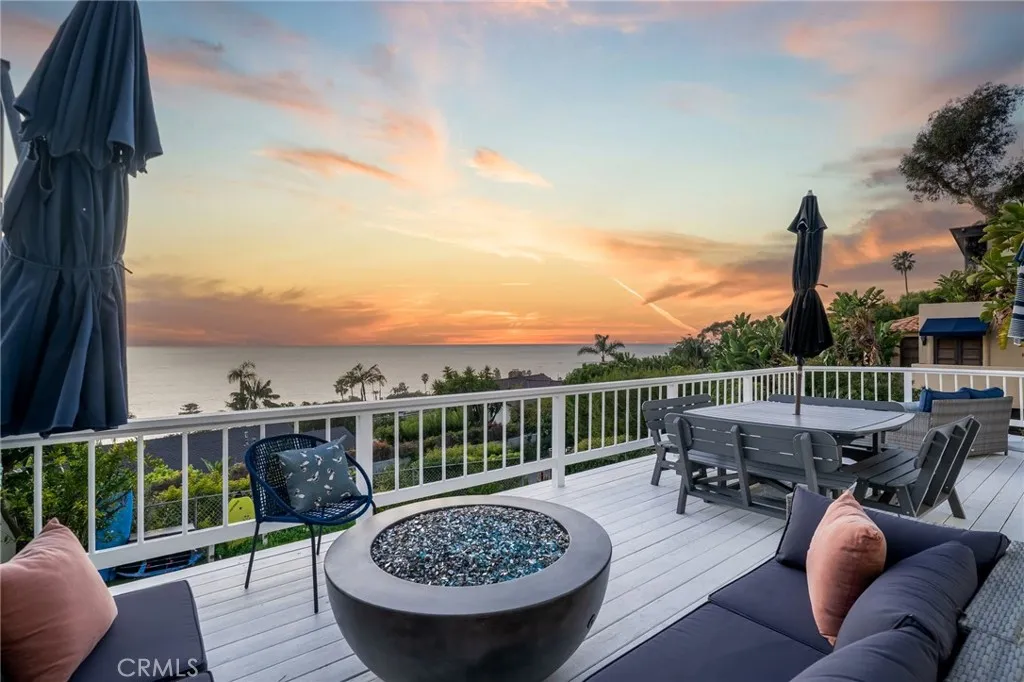 Welcome to 31331 Holly Drive, with seeping 180-degree ocean views, this rare street-to-street South Laguna residence captures the coastline, open Pacific, and unforgettable Catalina Island sunsets from a truly front-row setting. Enter from Holly Drive and exit to Brooks Street below, just minutes from the sand at West Street Beach, a location that perfectly blends privacy, walkability, and iconic scenery. This fully renovated coastal modern spans two levels cascading toward the Pacific, with sweeping ocean views and golden sunsets from nearly every room. Vaulted natural wood ceilings, a fireplace, wide-plank oak floors, and full-wall glass sliders blur the line between indoors and out, opening to a spacious ocean-view deck with fire pit. Front row for Catalina Island sunsets year round. The designer kitchen features a dolomite island, dark shaker cabinetry, and farmhouse sink. The primary suite enjoys its own private ocean-view deck, while the lower level offers two generous bedrooms, two full baths, and an expansive entertaining deck with fire pit. A dedicated studio with glass slider entry, outdoor shower, covered front porch, and detached two-car garage complete the home. Multiple outdoor living zones, endless Pacific views, and one of Laguna's most coveted stretches of coast.
