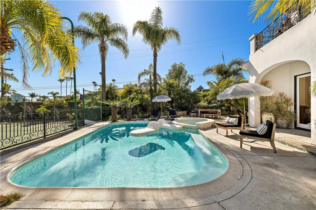 This exceptional contemporary estate embodies refined Zen-inspired architecture and seamless indoor-outdoor living, framed by breathtaking south-facing mountain views. Designed for both serene retreat and sophisticated entertaining, the residence offers expansive living spaces, multiple fireplaces, and glass doors that open to curated outdoor environments. The main level unfolds with a dramatic living room anchored by a statement fireplace, an dramatic Island with seating, a bar, separated dining area, and intimate wine lounge. A private guest suite with fireplace, spa-style bath, and direct outdoor access enhances the thoughtful floor plan. A dedicated laundry room is conveniently located on this level. Upstairs, the primary suite is a true sanctuary overlooking the pool and tennis courts, featuring a Romeo and Juliet balcony and panoramic mountain vistas. The suite offers a fireplace, an oversized spa-inspired bath with dual vanities, walk-in closet, separate shower and water closet, and an additional fireplace within the bath for an elevated retreat experience. Two additional bedrooms are connected by a Jack and Jill layout with individual vanities and a shared shower and water closet. A fifth bedroom functions as a fully self-contained private suite with its own kitchen, washer and dryer, walk-in closet, private bath, and a private outdoor terrace with mountain views. The resort-style grounds are nothing short of extraordinary, featuring a built-in barbecue, multiple outdoor dining and lounge areas, tranquil koi pond with waterfall, separate pool and spa, tennis and pic