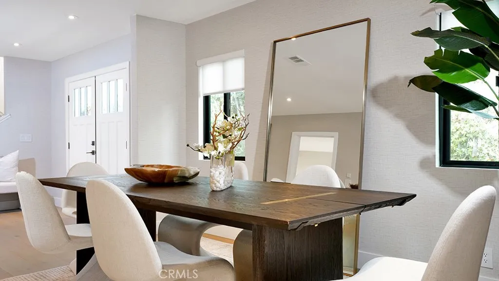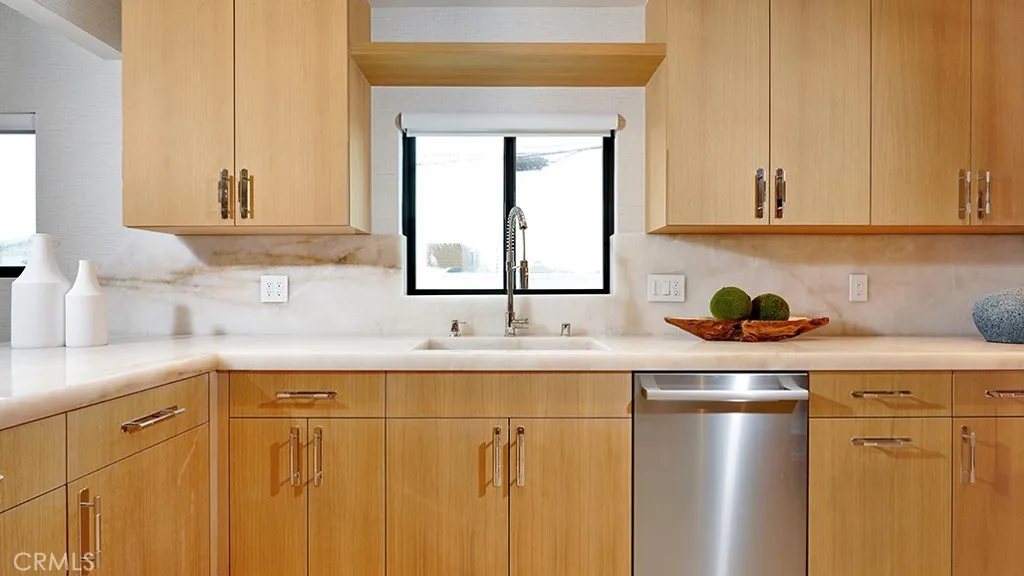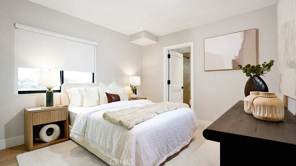 A statement in coastal refinement, this fully reimagined Corona del Mar residence captures elevated design, thoughtful craftsmanship, and peek-a-boo ocean views from its second level. Recently remodeled throughout, offering four bedrooms, four full bathrooms, and approximately 2,155 square feet of curated living space, all set on an expansive 9,122 square foot lot, a rare offering in the Village. Engineered wood flooring runs seamlessly underfoot, while York wallpaper introduces soft texture and dimension. Restoration Hardware lighting punctuates each room with warmth and sophistication, creating a cohesive, designer-forward aesthetic. Living area centers around a sleek fireplace and opens through French doors, drawing in natural light and coastal air. Outdoor spaces further elevate the property, offering a generous grassy yard framed by mature greenery and crisp white fencing, providing privacy and a true sense of openness rarely found in Corona del Mar Village. An upper-level terrace captures neighborhood vistas and peek-a-boo ocean views, creating a bright, sun-drenched setting ideal for morning coffee or evening gatherings. Clean architectural lines and thoughtfully placed planters enhance the simplicity of the space while maintaining its relaxed coastal feel. Kitchen is both architectural and functional, appointed with Crystallo quartzite natural stone surfaces, custom cabinetry, and fully integrated sinks. Rohl faucet and professional-grade appliance suite including Thermador refrigerator, range, and microwave, paired with a Bosch dishwasher, deliver performance equal