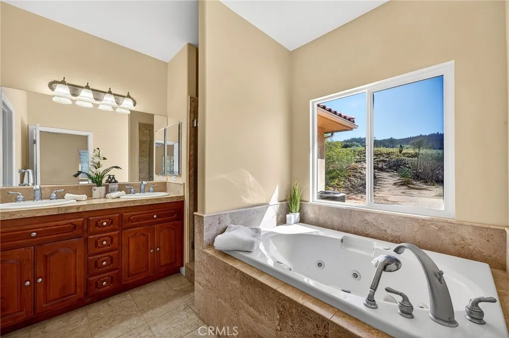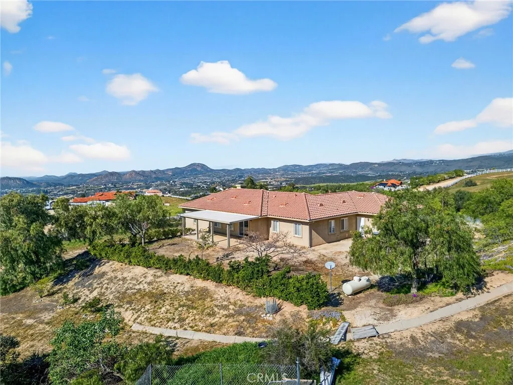 Welcome to this beautifully situated single-story custom home in the heart of Temecula Wine Country. Built in 2009, this 4-bedroom, 3.5-bath residence offers approximately 2,760 sq ft of thoughtfully designed living space on 4.60 fully fenced acres. All main living areas are conveniently located on one level, creating comfort and ease throughout the home. The primary suite is privately positioned on its own wing, offering a peaceful retreat. On the opposite side of the home, three additional bedrooms provide an ideal layout two connected by a Jack-and-Jill bathroom, while the front bedroom enjoys its own private bath. The spacious kitchen features rich wood cabinetry, granite countertops, and ample prep space, opening to inviting living areas with beautiful natural light and serene views. A lower-level multipurpose room with private entrance and half bathroom offers incredible flexibility perfect for guests, extended family, a home office, gym, or media space. The property includes an electric gate, paved driveway, and a graded pad ready for a future ADU. covered Alum wood back patio ideal for outdoor entertaining, wiring for surround sound and security cameras, and built-in speakers installed in the downstairs living areas, gutters and a sprinkler system installed along the property slopes for added functionality and ease of maintenance, with room for a pool, vineyard, or outdoor entertaining area, the possibilities are endless. Enjoy privacy, open space, and panoramic views just minutes from Temeculas renowned wineries, dining, and shopping.