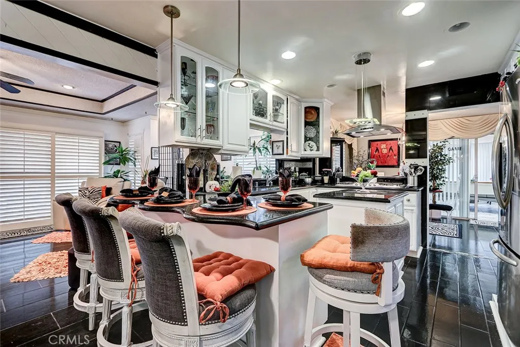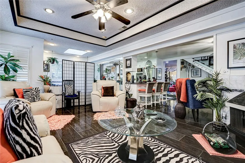 This showstopping 3-bedroom, 3-bathroom home delivers over 2,150 square feet of bold, custom living on a quiet Carson street. Built in 1971 and extensively personalized by a long-time owner, this two-story residence is packed with character and unexpected amenities at every turn. Step inside to a dramatic formal living room anchored by a stone fireplace, elegant swag draperies, and a wall of mirrors that amplifies the generous space. The open-concept family room flows seamlessly into a stunning kitchen featuring white cabinetry, black granite countertops, a center island with breakfast bar seating, gas cooktop with modern range hood, stainless steel appliances, pendant lighting, and glass-front upper cabinets. The family room showcases dark tile flooring, a freestanding fireplace, tray ceilings with decorative trim, recessed lighting, and plantation shutters throughout. Beyond the main living areas, the home features a game room with space for a full-size pool table and built-in bar seating, plus an adjacent home gym equipped with mirrored walls for a complete workout setup. A dedicated hot tub room with plantation shutters offers a private place to unwind any time of year. The primary suite is a true retreat, complete with its own fireplace, wall-mounted TV, and a spa-like en suite bathroom with a jetted soaking tub, marble-style tile, crystal pendant lighting, glass-enclosed shower, and dual vanity. An additional bedroom currently serves as an office/media room with mirrored accent wall. Outside, the backyard is a tropical oasis featuring a koi pond with a wooden footbrid