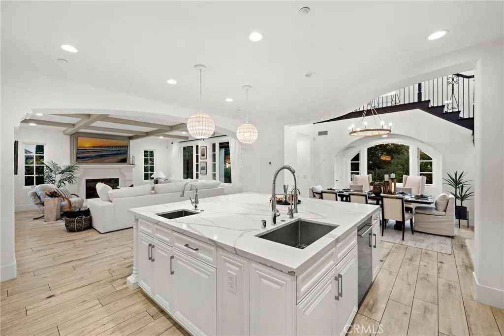 Price Improvement Now Offered at $5,990,000. Experience refined coastal luxury in this beautifully reimagined residence located within the prestigious guard-gated community of Pacific Ridge in Newport Coast. Thoughtfully redesigned throughout, the home blends timeless architecture with modern sophistication and offers sweeping ocean, Catalina Island, canyon, and city-light views from multiple indoor and outdoor living spaces. A gated loggia entry leads to a highly functional floor plan featuring a rare main-level ensuite bedroom with a private entrance, ideal for guests, extended family, home office, or au-pair accommodations. Interior highlights include premium wood-look tile flooring, custom designer lighting, and an open-concept great room with wood-beamed ceilings, fireplace, and French doors opening to the serene backyard for seamless indoor-outdoor living. The chefs kitchen is appointed with top-tier appliances including a Wolf 6-burner range with BBQ, Sub-Zero refrigeration, Miele cappuccino station and convection oven, quartz countertops, and an expansive Calacatta marble center island. Upstairs, the oversized primary suite captures panoramic ocean and Catalina views and features a private balcony, freestanding soaking tub, walk-in closet, makeup vanity, and soaring ceilings. Two additional guest bedrooms, a spacious laundry room, and a quiet office/library nook complete the upper level. The wraparound backyard borders a peaceful canyon and is designed for entertaining with a covered loggia, Lynx outdoor kitchen with refrigerator and bar seating, built-in fire pit,