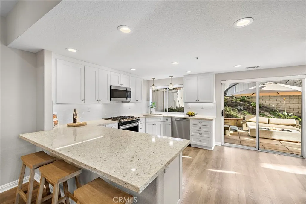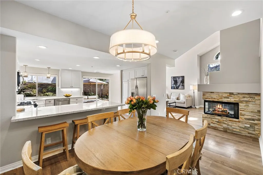 Experience refined coastal living in this upgraded end-unit home in the desirable Vilamoura community of Rancho San Clemente. Soaring ceilings and abundant natural light create an open, airy feel, while thoughtful upgrades and seamless indoor-outdoor flow enhance everyday living. Just minutes from the ocean, this three-bedroom, two-and-a-half-bath residence also features one of the neighborhoods few full-length driveways and a beautifully landscaped patio perfect for relaxing and entertaining. The main floor features an open-floor-plan living space with high ceilings, an elegant dual-sided fireplace, a chefs kitchen with quartz countertops, white soft-close shaker cabinets, stainless steel appliances, a generous peninsula, and plenty of cabinet space. The lower level also provides direct garage access, indoor laundry, a spotless epoxy-coated garage floor, and the oversized driveway. Upstairs, the spacious primary suite offers its own cozy fireplace, a private balcony, a walk-in closet with a built-in organizer, and a beautifully remodeled primary bath with dual sinks and a designer tile shower. Built-in hallway cabinets maximize storage and convenience. Additional features include a whole-home water filtration system, an EV-charger outlet, automatic window coverings, and a garage with epoxy flooring and overhead storage. Residents enjoy easy access to the communitys ocean-view pool and spa, Lifetime Fitness, Lobo Elementary, scenic trails, and nearby shopping and dining.801 Via Presa perfectly blends style, comfort, and coastal convenience.