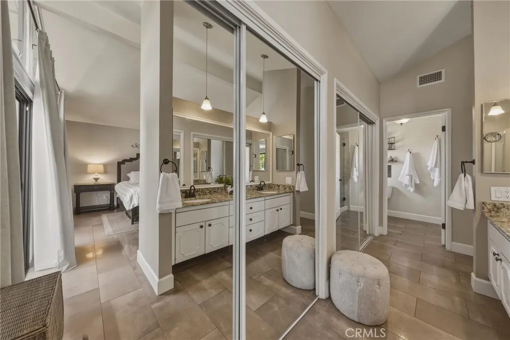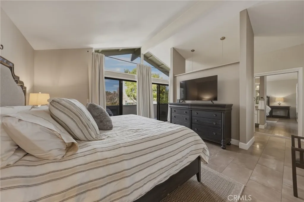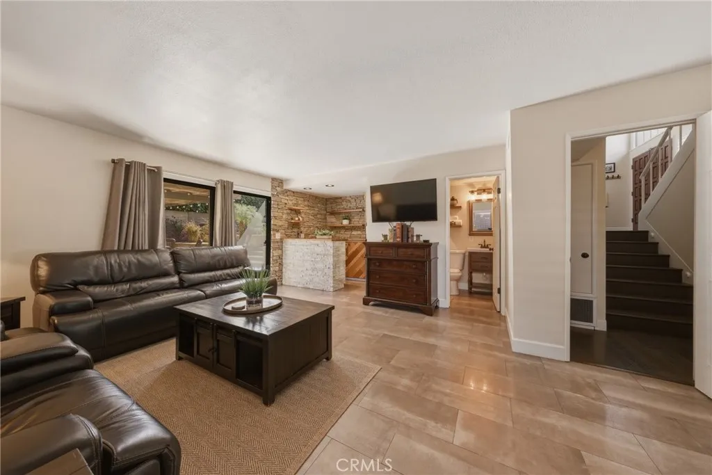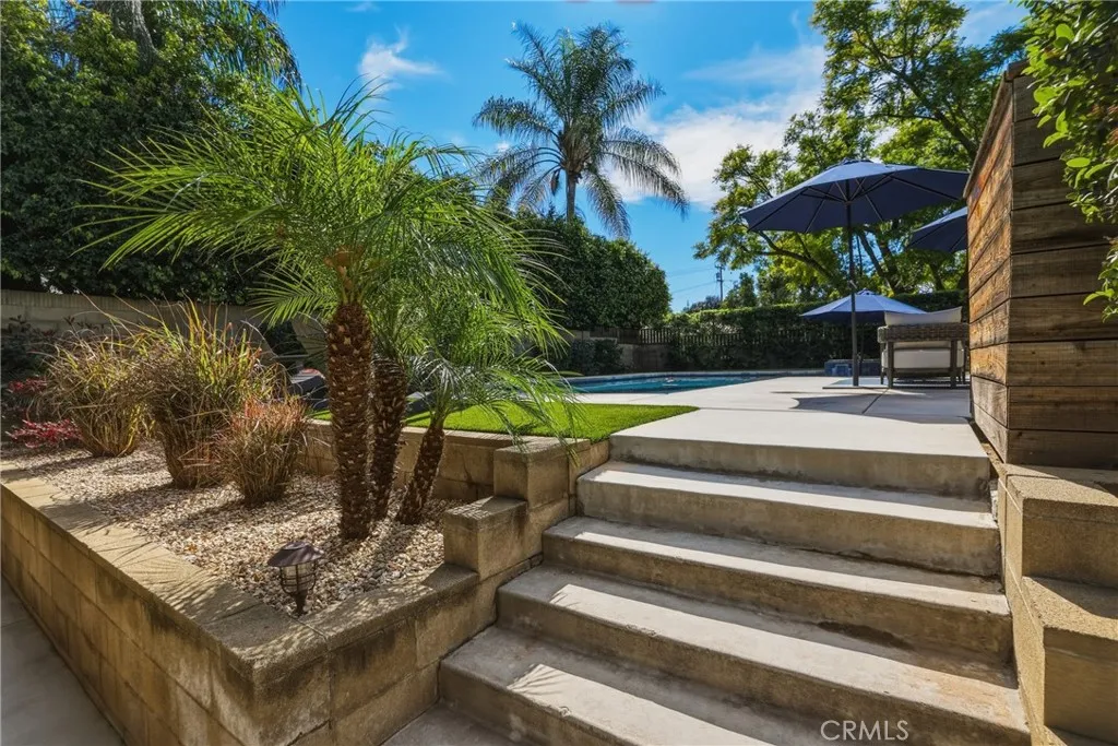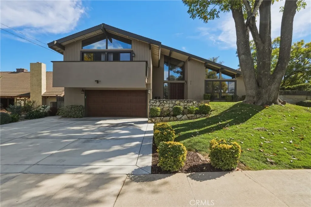 Stunning mid century modern home on a quiet cul de sac in highly desirable South Redlands. Situated on a generous 9,020 square foot lot, this 4 bedroom, 3 full bath residence offers 2,713 square feet of thoughtfully designed living space with sweeping mountain views and abundant natural light. From the moment you arrive, the mature tree lined street and curb appeal set the tone. Inside, dramatic beamed and cathedral ceilings, expansive picture windows, and an open floorplan create a bright, inviting atmosphere. The main level features a grand living room with a striking rock fireplace, a large foyer framed by oversized windows, and direct access to your backyard oasis. The kitchen offers granite counters, generous cabinetry, breakfast bar seating next to a convenient door leading to the pool and outdoor entertaining area. Upstairs you will find three spacious bedrooms, including a primary suite with private sitting balcony, two closets, and an en suite bath with dual sinks, soaking tub, and separate shower. The additional bedrooms are light filled and generously sized. A laundry chute adds charm and functionality. The lower level offers exceptional flexibility with a private oversized bedroom ideal as a second primary suite or guest quarters. It includes a large closet, kitchenette with cabinetry, full bathroom, and a private entrance to the covered patio area and backyard entertainment space, perfect for multi generational living or extended stays. The backyard was reimagined with a beautifully designed pool built in 2018, surrounded by lush landscaping and ample patio spa