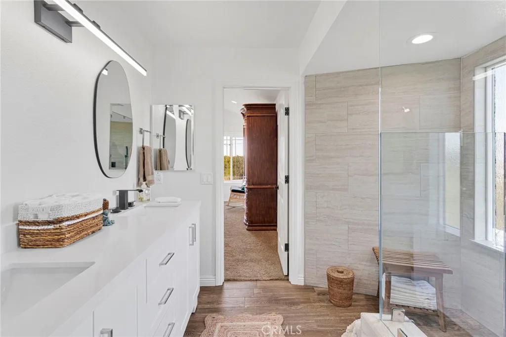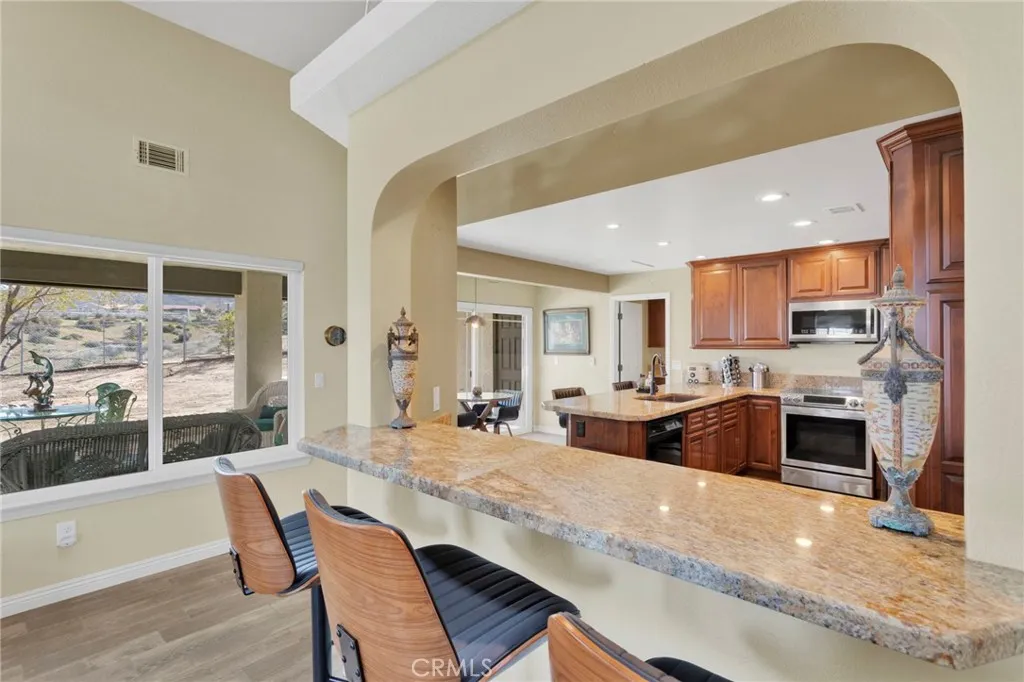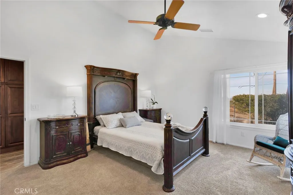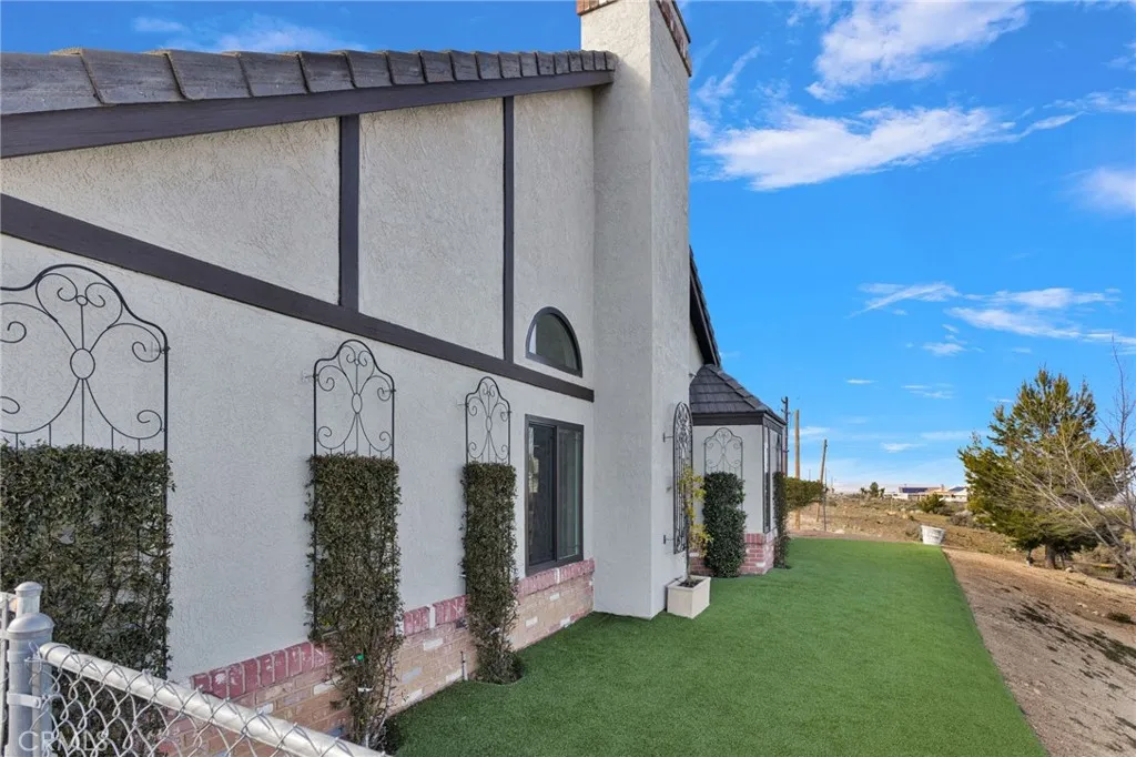 Beautifully appointed Tudor-style view home on 4.2 acres designed for refined equestrian living. Thoughtful landscaping includes turf areas, river rock, pollinator shrubs, mature pines, trellises, and gated barn access. Inside, vaulted ceilings and abundant natural light enhance the open living, dining, and kitchen areas with custom cabinetry, granite countertops, granite fireplace surround, and energy-efficient mullioned windows capturing sweeping valley, city-light, and San Gabriel Mountain views. Porcelain wood-look tile with subfloor radiant heat adds comfort. The Zen-inspired primary bath features a pebble-floor shower, rain head, marble double vanity, and spa-like finishes. A 3-car garage with workshop and two storage sheds add function. The 36x48 center-aisle barn offers eight 12x12 stalls (six matted with paddock access), water, 110-power, crossties, and storage. Enrichment turnout, arena space, sandy round-pen pad, and HORSE TOUGH fencing complete this exceptional horse property.