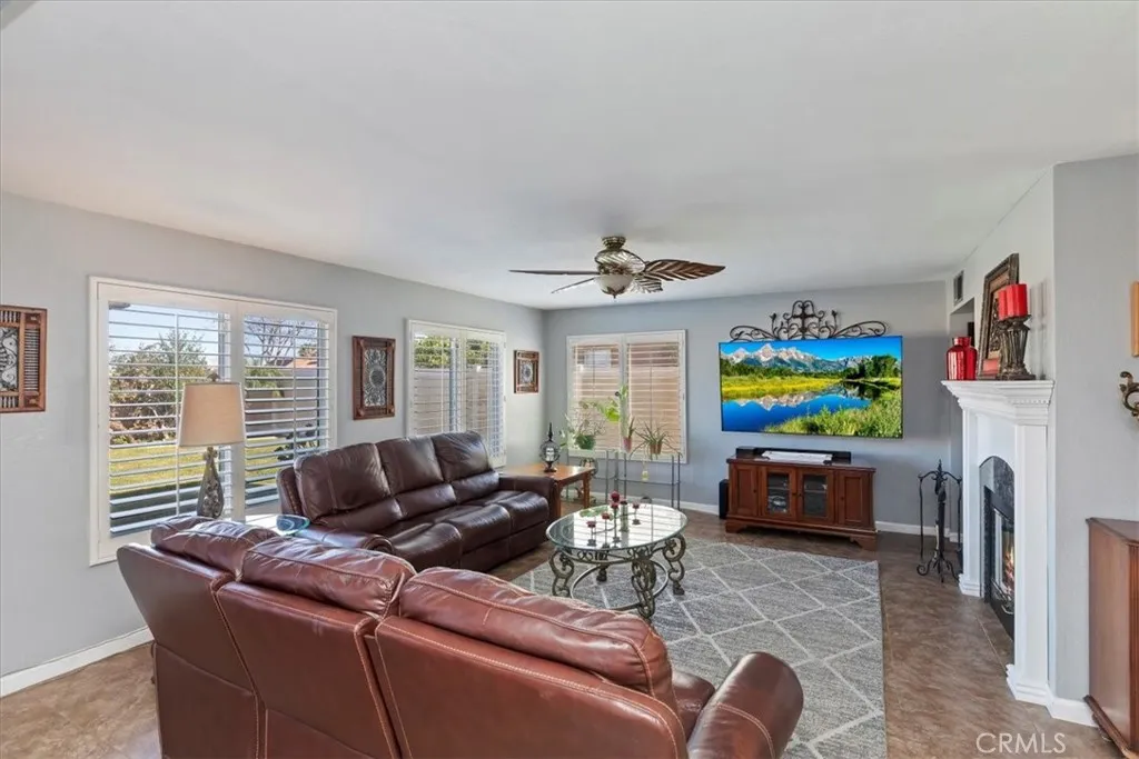 Beautiful traditional home in one of the most sought-after locations, just 10 minutes from the Orange County border and in the best school district. Offering 2,762 square feet of living space, this spacious residence features five spacious bedrooms and three bathrooms. The island kitchen is a standout, showcasing gorgeous granite countertops, a travertine backsplash, white cabinetry, a 48-inch Thermador refrigerator, stainless steel appliances, a walk-in pantry, and upper and lower cabinet accent lighting. Downstairs includes a formal living room and dining room, along with a spacious family room highlighted by an upgraded mantel and granite fireplace surroundperfect for gatherings and everyday living. A stunning wrought iron staircase leads upstairs to five bedrooms and two bathrooms. The entire upper level features wood flooring. The primary suite offers volume ceilings and captures panoramic city light and mountain views. The primary bath includes dual sinks, a soaking tub, separate shower, and a large walk-in closet. Additional features include plantation shutters, ceiling fans, solar, a three-car garage, and a beautifully maintained backyard with a pergola, guava tree, and two storage sheds. Ideally located near parks, schools, shopping, Skyline Trail and diningwith no HOA. Proudly offered by the original owners, this home has been exceptionally well maintained and is move-in ready.