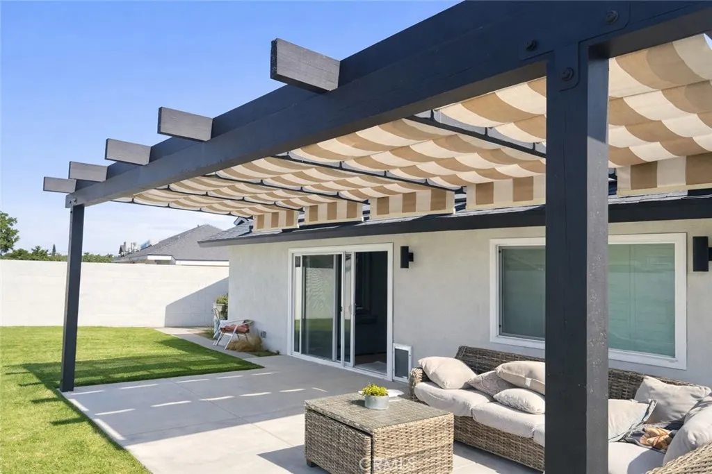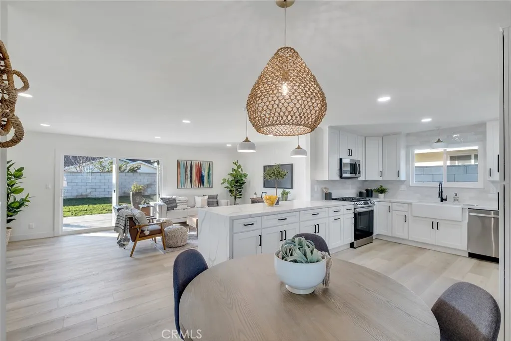Absolutely breathtaking Huntington Beach home, nestled in a beautiful family neighborhood, completely re-imagined from top to bottom, inside & out in 2022! Every detail of the home has been meticulously taken into consideration, with impressive features, layout, and flow inspired by a professional design team. Some details include: breath-taking kitchen and bathrooms, whole house re-pipe, dual pane windows, new hardscape & landscape, finished garage, etc!! The dining area is appointed with massive windows and a boho style chandelier, bringing beautiful light into the space. The kitchen features a massive 8 foot peninsula with waterfall finish, crisp shaker cabinetry, and modern lighting and fixtures. The main living area features stunning floor to ceiling wide plank vertical shiplap that brings texture and personality. Your primary bedroom retreat features an enormous bathroom with stylish and unique finishes, not normally found in other homes on the market. The guest bathroom is extremely impressive with fun pattern tiles, a beautiful vanity, and gorgeous fixtures. Some additional key notes of the home include mentioning the large front and back patios, new landscape, concrete and hardscape, automatic sprinklers, finished garage with recessed lighting, epoxy flooring and newer garage door, Eternity Brand vinyl plank flooring, Bedrosian's tile & stone, Plantation shutters, Samsung appliances, Starbridge custom windows, black barn doors, recessed lighting, custom black modern fixtures, back patio pergola with retractable awning & so much more! This one level home is absolute