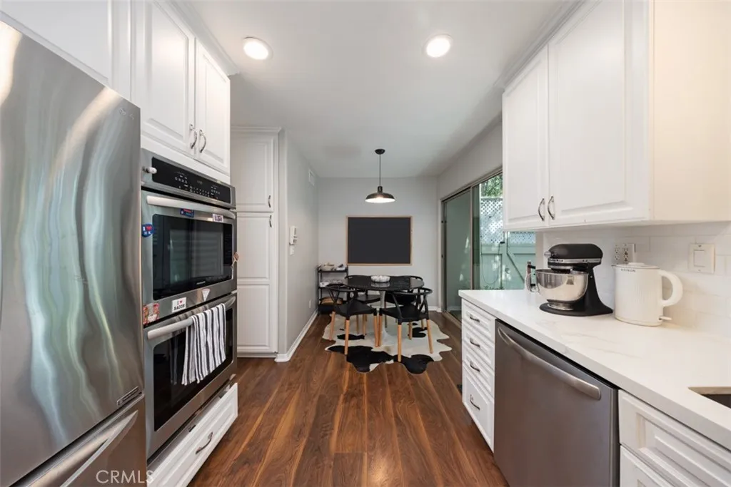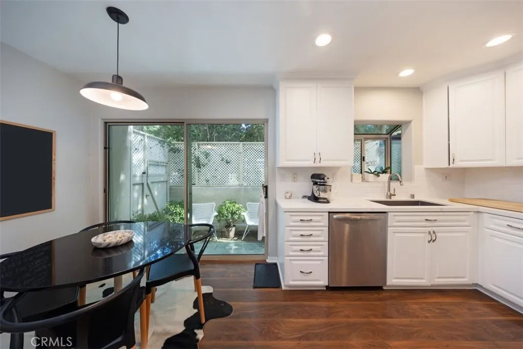 Welcome Home to 14101 Dickens St #9, this beautifully updated townhome in the heart of Sherman Oaks, offering an exceptional blend of space, style, and indoor-outdoor living. Step inside to a light-filled living area featuring recessed lighting, rich wood-style flooring throughout, and a sleek fireplace that anchors the space. The open layout flows seamlessly to a private front patio, creating an inviting extension of the main living area. The newly renovated kitchen is crisp and modern with quartz countertops, stainless steel appliances, a gas cooktop, double wall oven, built-in microwave, and ample cabinetry. Clean lines and thoughtful finishes make it both functional and visually striking. Just beyond, a second patio provides additional outdoor space ideal for dining, relaxing, or entertaining. Upstairs, the spacious bedrooms offer comfort and scale rarely found in similar units. The primary suite features soaring vaulted wood-beamed ceilings, an airy retreat feel, and its own private balcony. The home includes two full bathrooms upstairs and a convenient powder room on the main level. With in-unit laundry, central heating and air conditioning, two parking spaces, and additional storage, this home delivers both convenience and thoughtful design. Ideally located just moments from Ventura Boulevards shopping, dining, and entertainment, this is Sherman Oaks living with rare outdoor versatility.