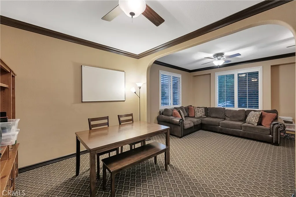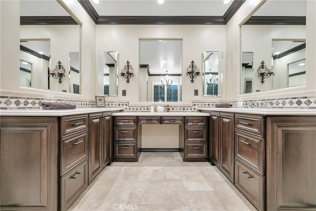 Welcome to this beautifully upgraded two-story home located in the highly sought-after Tesoro community. From the moment you enter, youre greeted by a grand formal entry with mosaic tile flooring and an elegant formal living and dining area highlighted by Versailles travertine flooring and custom faux and Venetian plaster finishes. The stunning chefs kitchen serves as the heart of the home, featuring granite countertops, Omega cabinetry, a double oven, and a 4-burner cooktop with griddle, all opening to a warm and inviting family room with a stone fireplace, crown molding, and designer accents throughout. Upstairs, the spacious primary suite offers dual crown molding, a comfortable sitting area, and a spa-inspired bathroom complete with separate vanities, a soaking tub, and a rain shower. Three additional upstairs bedrooms provide ample space, while a downstairs bedroom suite, thoughtfully converted from the third garage with its own private entrance from the front courtyard, offers flexibility for guests, multigenerational living, or a private office. Additional highlights include a beautifully upgraded downstairs bathroom with tiled shower and an upstairs laundry room with sink and folding station. Step outside to your own private resort-style backyard featuring a sparkling pool with Baja shelf and slide, a raised spa, covered patio with gas fireplace, built-in BBQ with granite counters, elevated seating deck, and a separate firepit area, perfect for entertaining or relaxing year-round. The meticulously landscaped grounds are enhanced with Malibu lighting, creating a warm