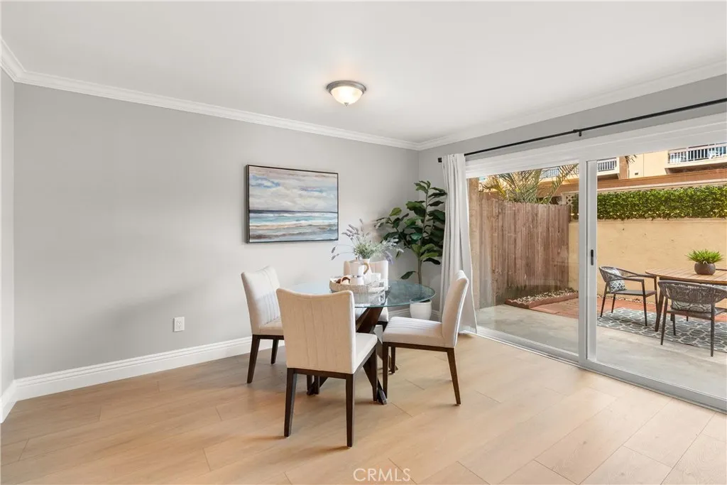 Huntington Beach move in ready downstairs unit with a large enclosed patio and no stairs, featuring brand new luxury vinyl flooring, recessed lighting, smooth ceilings, fresh designer paint, and crisp 5 inch baseboards with crown molding for a bright, finished look throughout. The updated quartz kitchen is both stylish and functional with custom cabinetry, stainless steel appliances, a farmhouse sink, designer tile backsplash, and a decorative chandelier that sets the tone for everyday living and entertaining. The spacious primary bedroom offers excellent storage, including three full sized mirrored closet doors plus built in dresser and cabinetry for effortless organization. The private ensuite bathroom showcases designer fixtures and custom tile finishes, creating a clean, spa inspired retreat. One of the standout lifestyle advantages is the ground level location, delivering easy access and a large enclosed patio that feels like an extension of the living space. Perfect for morning coffee, quiet evenings, or a bit of outdoor living without the upkeep. Additional storage adds everyday convenience. Residents enjoy community amenities including a sparkling pool, recreation room with pool table, and on site laundry. Monthly utility costs are simplified and often reduced because HOA dues include gas, water, trash, and sewer, offering meaningful built in savings and easier budgeting. Ideally located near the best of Huntington Beach, including a short drive to world renowned beaches, wetland walking trails, epicurean dining, and shopping. Enjoy quick access to Meadowlark Golf C