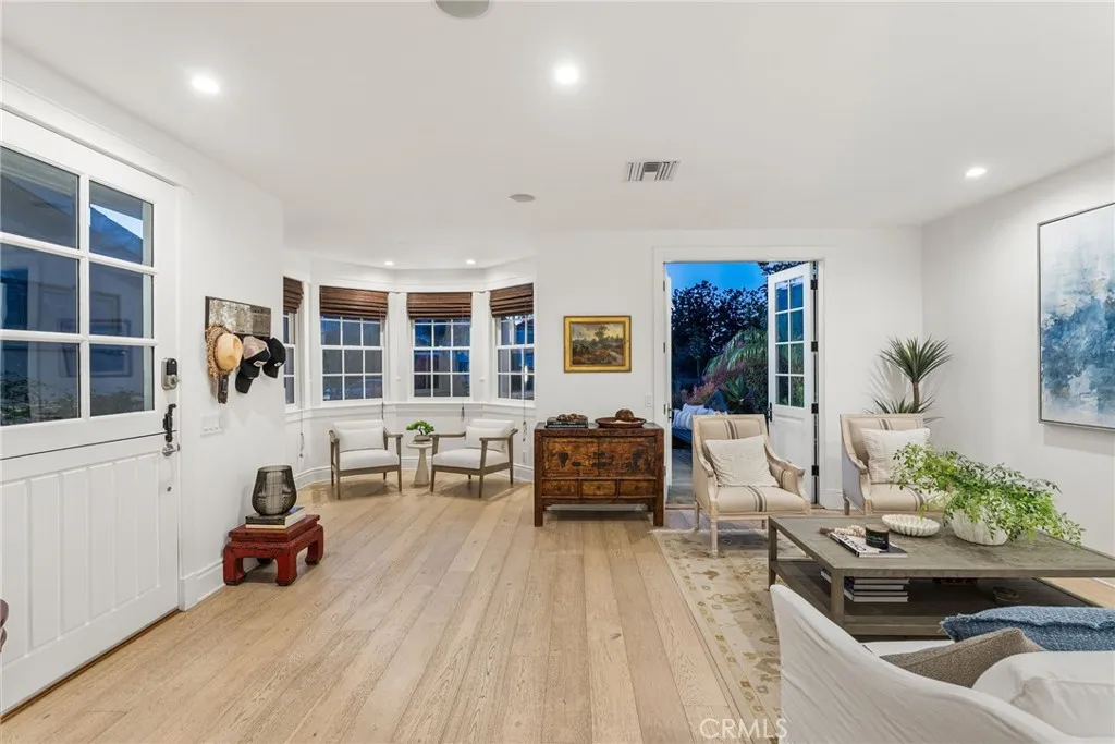 Elegant, contemporary Cape Cod living awaits just two blocks from the blue Pacific in Corona del Mar. Recently completed renovations have transformed this residence into a sophisticated, turn-key coastal retreat, featuring a magazine-worthy new primary bathroom, wide-plank French Oak flooring, plush new carpet, Calcutta Quartz counters, diagonal backsplash, fresh interior and exterior paint, and spectacular panoramic views from the rooftop deck. A charming white picket fence opens to a stone terrace surrounded by professionally designed landscaping and mature succulents. The Dutch front door and French doors off the living room welcome you into a light-filled, open floor plan offering a living room with reading alcove, formal dining area, and a spacious family room with built-ins, marble fireplace, and dining nook adjacent to the remodeled gourmet kitchen. The newly renovated kitchen showcases Calcutta Quartz countertops, center island with breakfast bar, and high-end Sub-Zero and Thermador appliances. French doors extend the living space to a covered rear loggia with ceiling heater, creating seamless indoor-outdoor living. Upstairs features four bedrooms plus a generous loft ideal for an art studio, office, playroom, or den. The expansive primary suite offers a private deck, sitting area with fireplace, and a newly completed spa-inspired bath with dual vanities, freestanding soaking tub, multi-head shower, and walk-in closet. Two secondary bedrooms share a Jack-and-Jill en-suite accented in Carrara marble. All bathrooms have been tastefully remodeled. French doors lead to