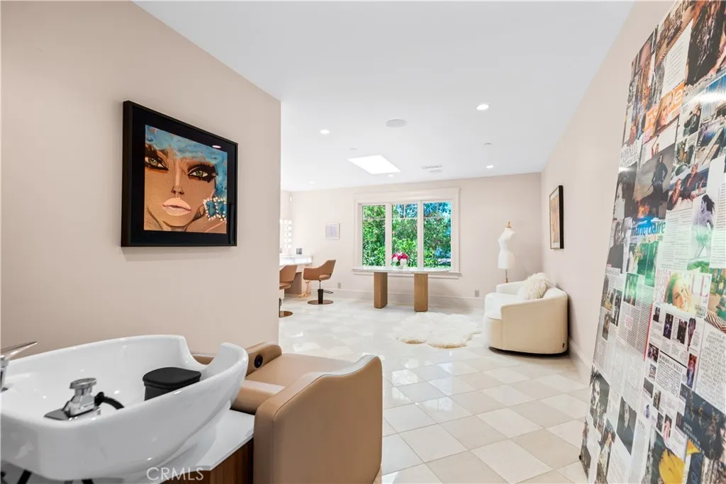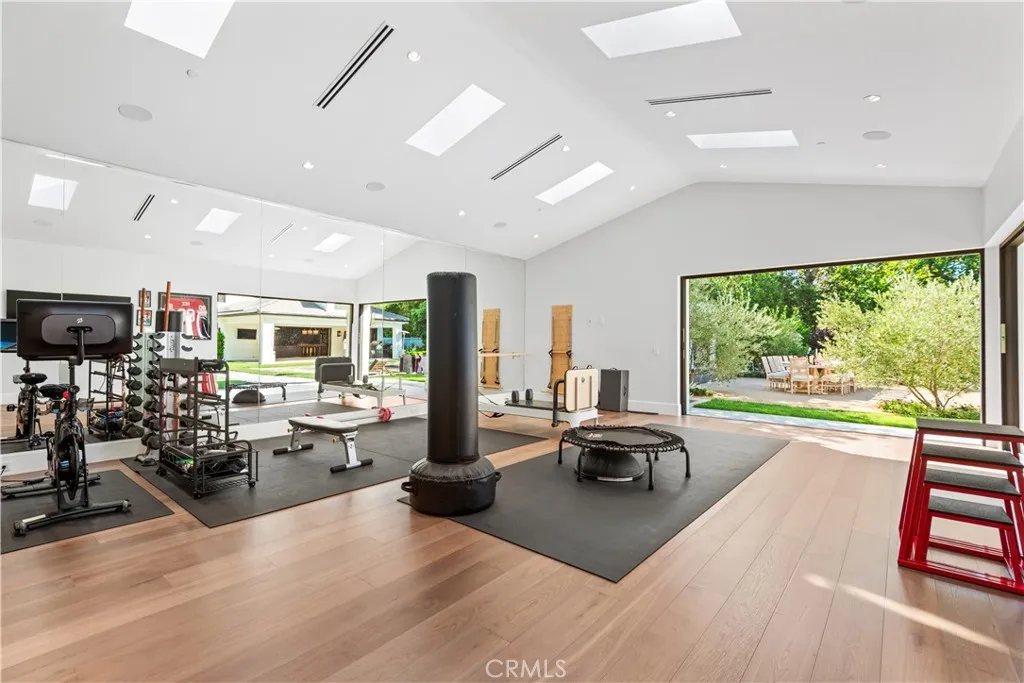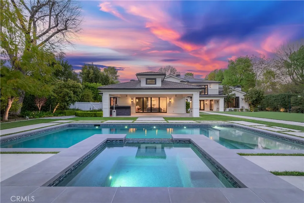 This model sharp and highly upgraded estate residence, complete with a new guest house, is sited on a superb 1.13 acre completely flat lot! Beautifully finished throughout, the home features a sunny open floor plan with a gorgeous, center island chef's kitchen, big adjoining breakfast room, all wide open to the great room & lounge with wet bar & temperature controlled wine room, plus a custom study, home theater, and a superb primary suite with an all stone bath, steam shower, enormous, room sized closets and adjoining glam room. The expansive family room has sliding walls of glass that open to the big backyard, highlighted by a large covered entertaining patio with full barbecue center, a sparkling pool & spa, sports court, big lawn with fireplace & outdoor dining area, and a guest house complete with steam & sauna, all nestled amongst mature trees. Additional amenities include heated floors in all upstairs bathrooms, a voice activated smart home system, a central vacuum system, owned solar power system, whole house 48 kilowatt generator, and a four-car garage, complete with custom cabinetry and 220 volt wiring for electric car chargers.