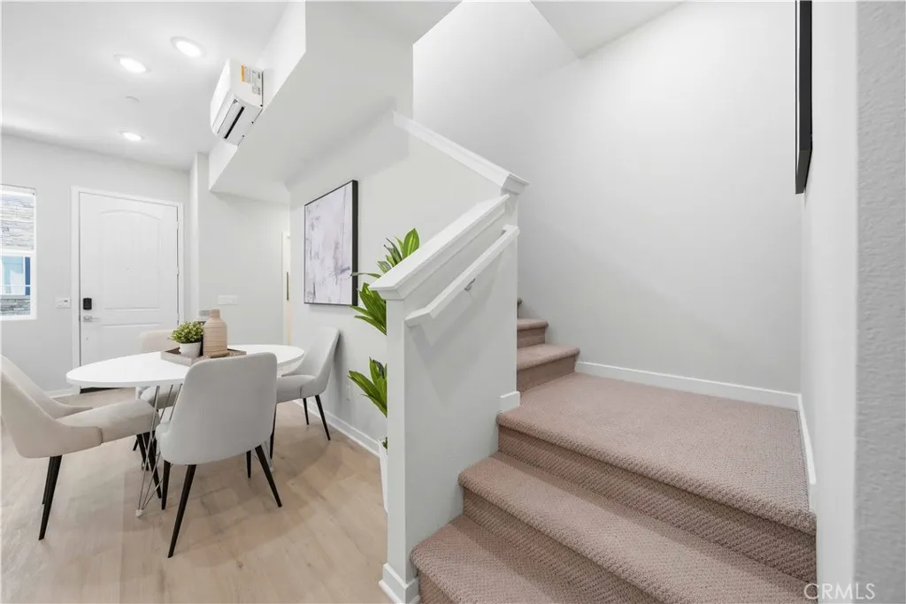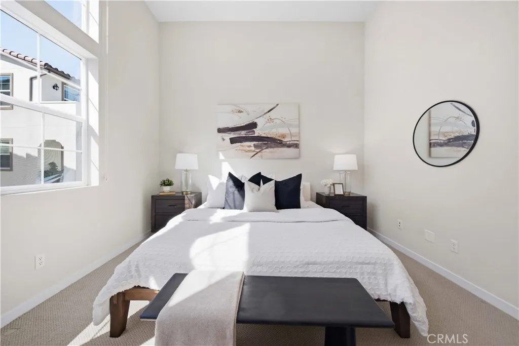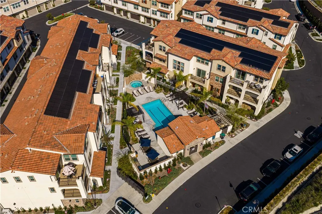 Welcome to 105 Lugo in Mission Viejo, a beautifully maintained, newer construction home built just about two years ago and proudly owned by its original owner. Located in the desirable Saddleback Place community by Trumark Homes, this modern residence offers the perfect blend of contemporary design, energy efficiency, and low-maintenance living. With approximately 887 square feet of thoughtfully designed space, the open-concept floor plan feels bright and spacious, enhanced by oversized dual-pane windows that fill the home with natural light. The main living area features wood-look luxury vinyl flooring, recessed lighting, and custom window treatments, creating a clean, sophisticated look. The kitchen is both stylish and functional, complete with stainless steel appliances, sleek countertops, white cabinetry, and seamless flow into the living and dining areasideal for everyday living and entertaining. Upstairs, plush upgraded Berber carpeting lines the staircase, hallway, and primary bedroom, adding warmth and comfort. The spacious primary suite is highlighted by dramatic 13-foot ceilings, creating an airy retreat with an open, light-filled ambiance. Built with todays efficiency standards in mind, the home includes owned solar panels and a tankless water heater, offering long-term energy savings. An oversized one-car garage plus an additional dedicated parking space provide added convenience. Residents enjoy access to the community pool, spa, and BBQ area, perfect for relaxing or gathering with friends. Conveniently located near the 241 Toll Road, major freeways, shopping,
