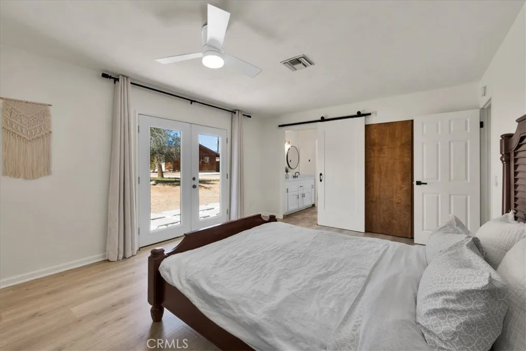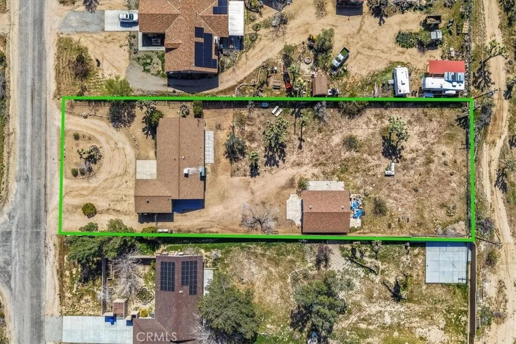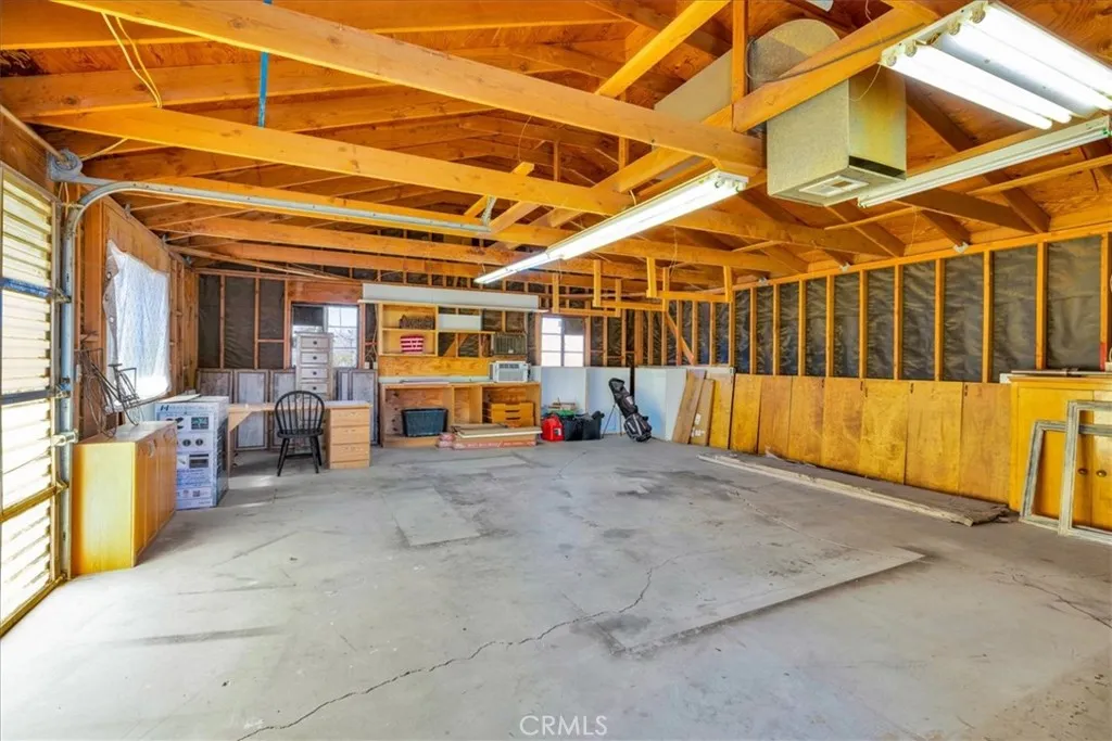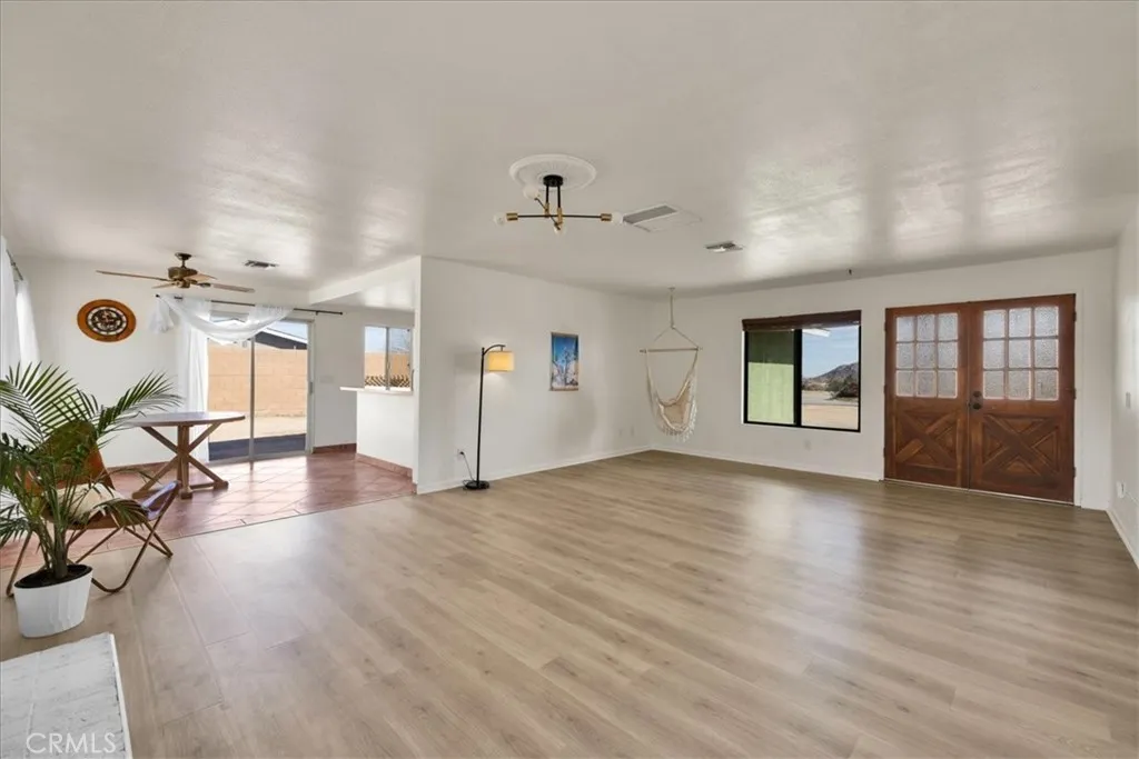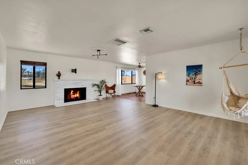 Located in the desirable Mesa area of Yucca Valley, this spacious 3 bedroom, 2 bath home sits on .67 acres and offers modern comfort, open living, and fantastic outdoor potential. An attached 2-car garage provides convenience, while the expansive interior layout creates an inviting place to gather and relax. The massive open concept living space features a classic masonry fireplace, stylish modern light fixtures, and laminate flooring that flows through the main living area, with tile flooring defining the kitchen and dining zone. The dining area includes sliding glass doors leading to the back patio and breakfast bar seating that connects seamlessly to the kitchen. The kitchen itself is well-appointed with stylish countertops, stainless steel appliances including a gas stove, and plenty of workspace. The guest bathroom showcases quartz counters, tile floors, and a walk-in shower. The primary bedroom is generously sized and includes its own sliding glass doors, a large closet, and an attached bath with dual sinks, additional closet, and a tub/shower combo. Both guest bedrooms are spacious and well positioned, and a built-in bench in the hallway adds character and functionality. Outside, the backyard offers a concrete patio, fencing for privacy, and a huge powered workshopperfect for hobbies, storage, or creative projects. With its blend of modern finishes, open design, and Mesa location, this home captures the best of high desert living.