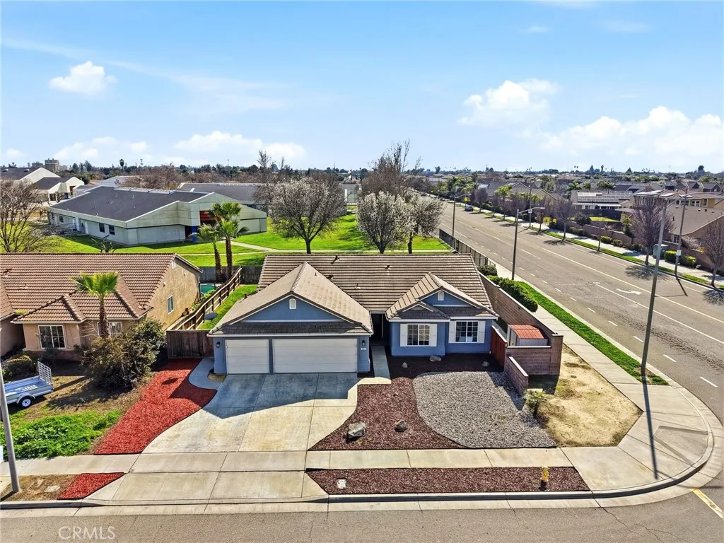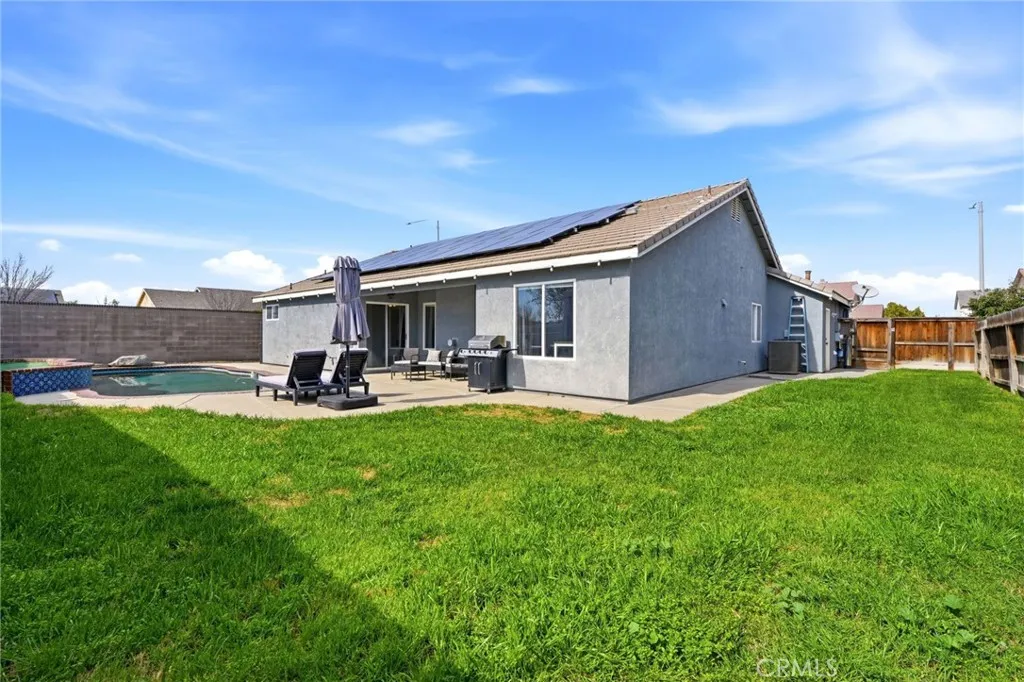Positioned on a prime corner lot, with seller incentives available, this rare 5-bedroom, 2 bath home offers space, privacy, and standout curb appeal in NW Lemoore. Inside, you'll find new laminate flooring throughout and a light, open-concept layout with vaulted ceilings. The spacious kitchen features granite counters, ample cabinetry, and a breakfast bar that opens seamlessly to the living area, complete with fireplace and backyard views. The primary suite offers direct patio access and a beautifully updated en-suite bath with dual vanities, soaking tub, and walk-in shower. Step outside to your private backyard retreat with a sparkling pool, perfect for summer gatherings and relaxing evenings. Solar has covered the sellers' usage even with the pool and a Tesla charger in the garage, offering meaningful energy savings. Additional highlights include a 3-car garage, whole-house water filtration system, security system, upgraded pool equipment, and smart sprinkler controls. Conveniently located near schools, parks, Lemoore NAS, and quick access to Hwy 198 & 41, this is the space, functionality, and efficiency buyers have been waiting for. Schedule your showing today!