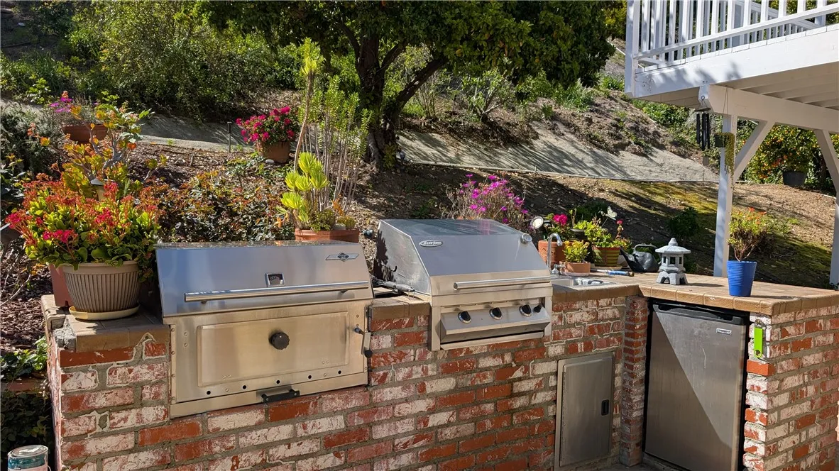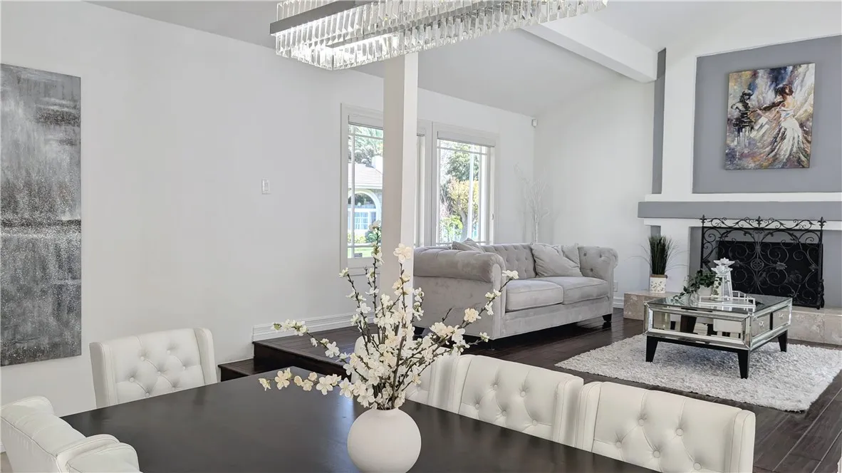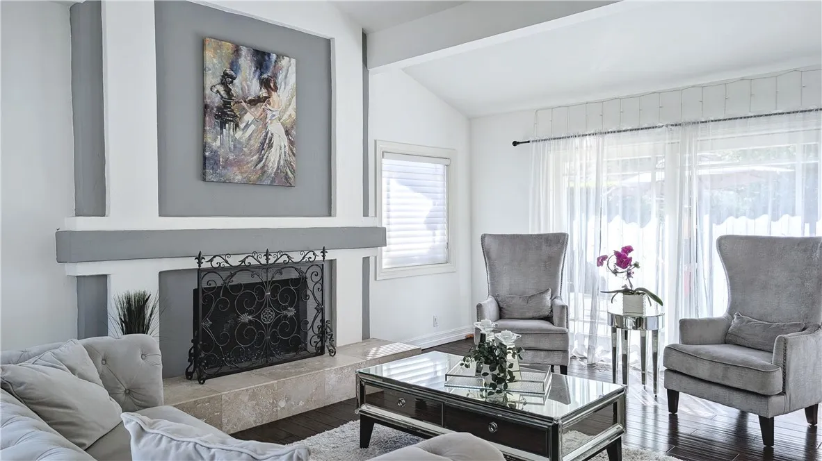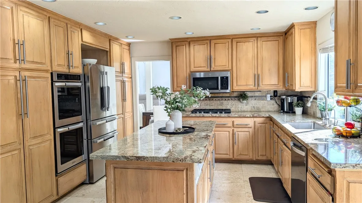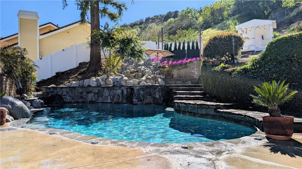 Tucked away on a quiet cul-de-sac south of Ventura Boulevard in the highly desirable Vista De Oro neighborhood of Woodland Hills, this move-in ready split-level home offers privacy, comfort, and resort-style indoor-outdoor living with pool, spa, fully paid solar, and no HOA. Surrounded by architecturally distinct homes and scenic hillside surroundings, the property features a light-filled open floor plan with soaring ceilings, wood and tile flooring, recessed lighting, and over $90,000 in upgrades. A welcoming entry opens to a vaulted living room with gas fireplace, expansive windows, and elegant light fixtures that fill the space with natural light. The kitchen features granite countertops, stainless steel appliances, a newer dishwasher, and travertine flooring. Sliding glass doors open directly to the backyard retreat, creating a seamless connection between indoor and outdoor living while providing a functional and stylish space for everyday living and entertaining. An oversized family room provides an additional gathering space with fireplace, recessed lighting, and French doors. Upstairs, the spacious primary suite offers a dual walk-in closets, a tiled shower, jetted soaking tub, dual vanities. French doors open to a private balcony overlooking the hillside, pool, and beautifully landscaped yard, adding to the sense of charm and tranquility. The backyard is designed for relaxation and entertaining, featuring a covered patio, multiple seating areas, built-in gas and charcoal barbecue, and a saltwater pool and spa with waterfall feature surrounded by mature landscaping.