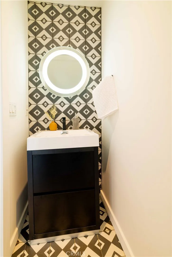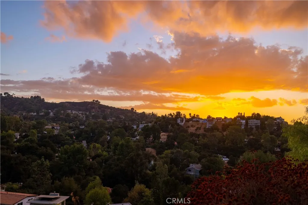 Set above the surrounding landscape with sweeping views of the Santa Monica Mountains, this thoughtfully redesigned Woodland Hills home blends architectural character with modern sophistication. Offering approximately 1,878 square feet, the home features 4 bedrooms and 2.5 bathrooms, highlighted by exposed beams, expansive black-framed windows, and abundant natural light throughout. The main living space is anchored by a designer kitchen with black and white two-tone cabinetry, quartz countertops, waterfall island seating for six, under-cabinet lighting, and stainless steel appliances including a double oven. A custom quartz dining table crafted from the same slab as the island creates a seamless, cohesive entertaining experience. The adjacent living room centers around a fireplace framed by a custom concrete accent wall. Indoor-outdoor living is a defining feature of the home, with three Trex decks positioned to capture panoramic mountain views, ideal for entertaining or quiet evenings at sunset. The primary suite serves as a private retreat, featuring a spacious walk-in closet with custom built-ins and skylight, plus a spa-inspired bath with hexagon tile flooring, floating dual vanity, oversized walk-in shower, and standalone soaking tub. LED backlit mirrors enhance all bathrooms. Energy-efficient split-system HVAC provides year-round comfort. Upstairs, a versatile loft/study space overlooks dramatic vistas, ideal for a home office or creative retreat. The property includes mature fruit trees like pomegranate, lemon, orange, and apple along with generous outdoor space. An