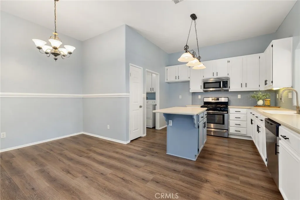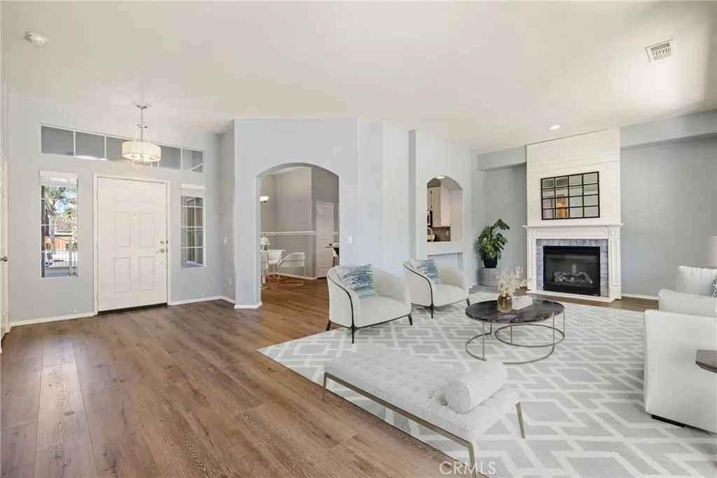This beautifully updated 3-bedroom, 3-bath home in Murrietas desirable Vintage Reserve community offers nearly 1,900 sqft of flexible living space, including a detached casita with its own bedroom and bathroom, and is positioned on a corner lot at the end of a cul-de-sac. Featuring solar, low taxes, and no HOA, the home offers privacy and functionality rarely found at this price point. Upon entry, you are welcomed into an open-concept living area showcasing fresh interior paint, luxury vinyl plank flooring, abundant natural light, and backyard views. Recessed lighting and a fireplace with custom mantle create a warm focal point anchoring the main living space. Just off the living room, the den offers flexible use as a home office, media space, or optional 3rd bedroom within the main home. The kitchen is conveniently positioned directly off the main living area, enhancing flow for both daily living and entertaining. The kitchen is appointed with Corian countertops, stainless steel appliances, resurfaced and freshly painted cabinetry, custom tile backsplash, pantry storage, and an island overlooking the dining area with space for a full-size table. Laundry and direct access to the two-car garage are located just off the kitchen. A secondary bedroom and nearby full bathroom with single-sink vanity and shower-tub combo are situated off the main living space. Down the hall, the spacious primary suite serves as a private retreat featuring dual closets, dual-sink vanity, soaking tub, walk-in shower, and separate toilet room. The detached casita enhances the homes versatility with