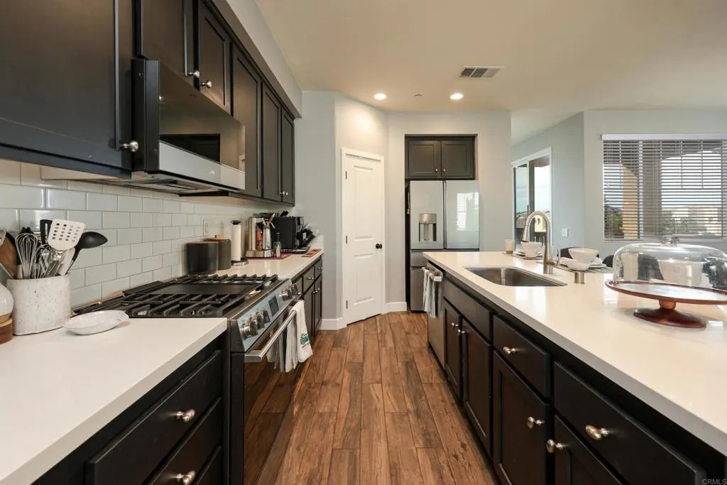 Beautiful 3-story townhome offering 4 bedrooms, 3.5 bathrooms, and 1,829 sq ft of thoughtfully designed living space. This modern home combines smart home technology, stylish upgrades, and a functional layout perfect for todays lifestyle. The first floor features a private bedroom with a full bathroom ideal for guests, extended family, or a home office. The second level showcases an open-concept living space with a spacious living room, dining area, and balcony that brings in natural light and fresh air. The stunning kitchen is designed for both everyday living and entertaining, featuring GE Caf Smart Appliances, a large center island, pantry, smart kitchen faucet, and beautiful wood-look tile flooring throughout. A half bath and laundry area are also conveniently located on this level. The third floor hosts the primary suite, complete with an en-suite bathroom and walk-in closet, along with two additional bedrooms and another full bathroom. Additional highlights include a gated front yard with low-maintenance turf, ceiling fans, smart LED lighting, Nest thermostat, Ring doorbell, and a 2-car attached garage with a 220 outlet. Residents enjoy a well-maintained community featuring two pools, playgrounds, and lush landscaping all conveniently located near major freeways for easy commuting. Sellers may consider a VA assumption for another VA buyer.