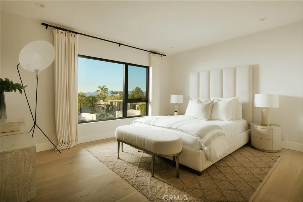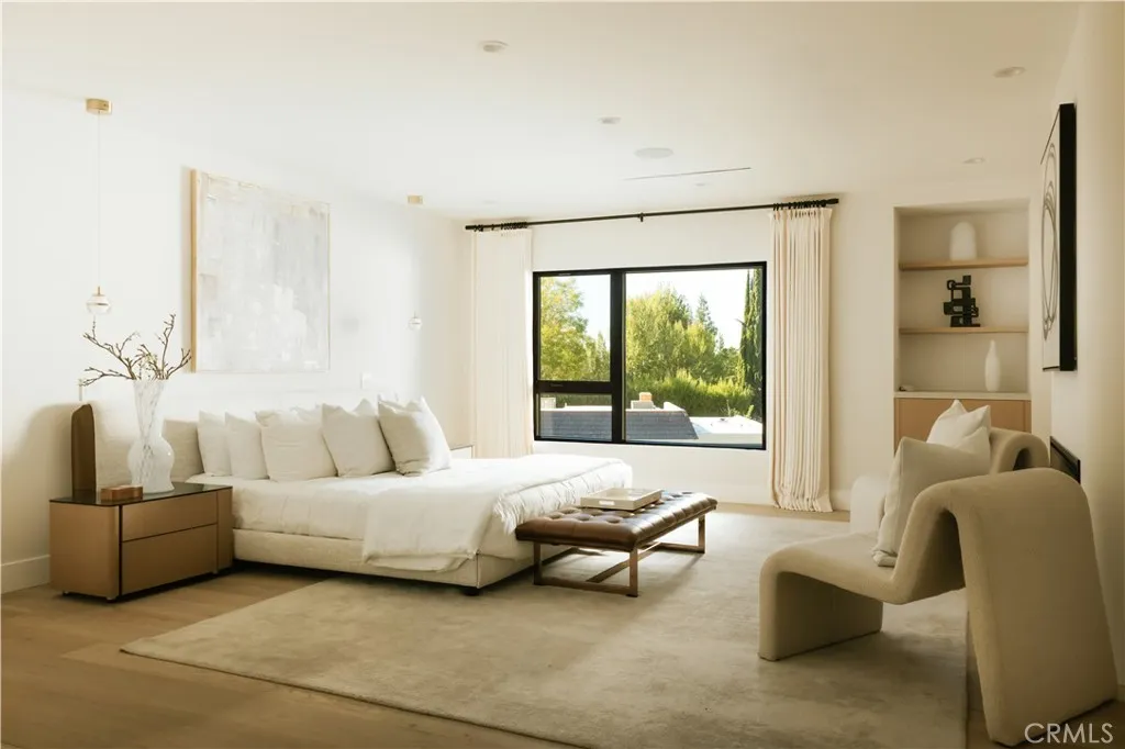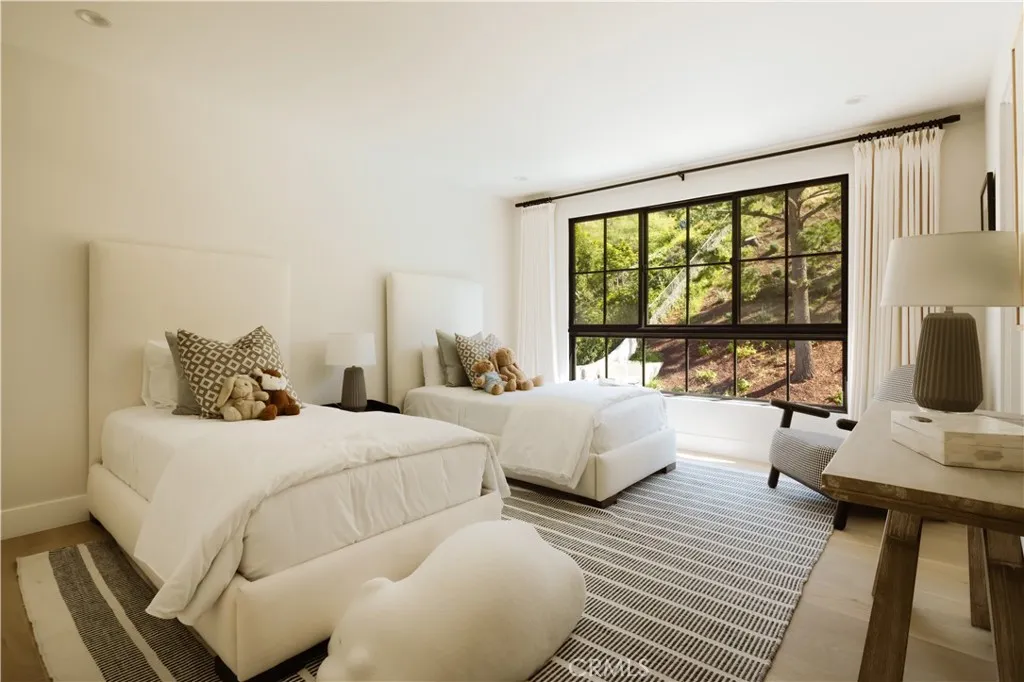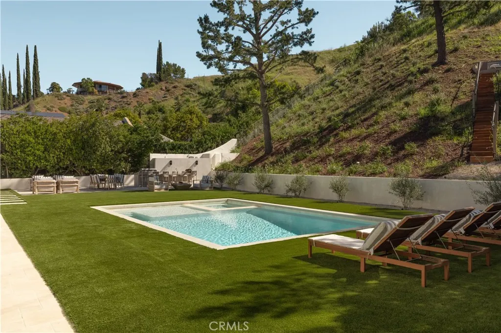 Situated in the coveted hills of Encino, this beautifully redesigned residence offers modern elegance, privacy, and sweeping views. Originally known as the iconic Karate Kid House, featured in the classic film The Karate Kid, the property carries a unique piece of Hollywood history while now showcasing a thoughtfully reimagined modern living experience. A welcoming entry introduces soaring ceilings, a striking staircase, and wide plank wood flooring that flows throughout the home. Generous living and entertaining spaces are framed by large windows that fill the interiors with natural light while capturing lush greenery and scenic hillside vistas. Living areas are anchored by sleek fireplaces, creating warm and inviting environments ideal for both everyday living and entertaining. The gourmet kitchen is thoughtfully designed with custom cabinetry, high end appliances, a large center island with seating, seamlessly opening to the surrounding living and dining spaces. Upstairs, a spacious recreation room with vaulted ceilings and exposed wood beams offers a versatile gathering space perfect for a media lounge, game room, or relaxed family living. The primary suite provides a peaceful retreat, featuring a spa inspired bathroom with a soaking tub, oversized shower, dual vanities, and an expansive walk-in closet. Designed for both entertaining and everyday enjoyment, the backyard offers a true resort like setting with a pool and spa, multiple lounge and dining areas, an outdoor kitchen and BBQ, and lush landscaping that extends up the hillside, creating a private outdoor environm