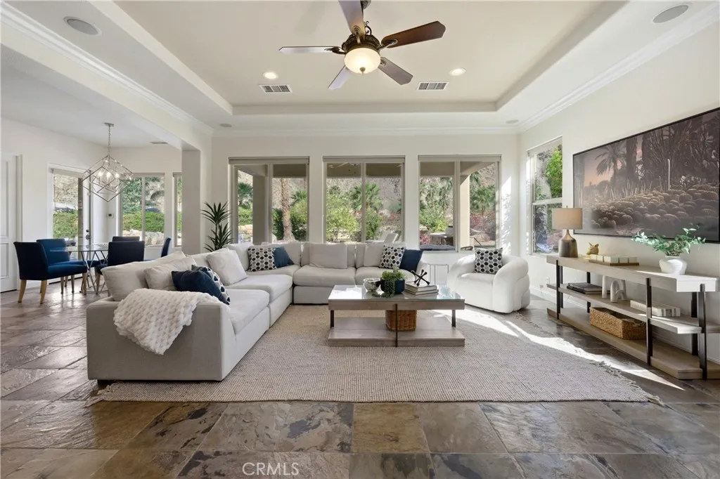 HIDDEN CANYON DESERT OASIS - WELCOME TO WHITE FOX RESORT. Located at the end of a cul-de-sac under the Santa Rosa Mountains and Cove, this single-story home is situated on a premium 16,117 sqft lot in the gated community of Hidden Canyon. Beyond a private courtyard with a wrought-iron gate and fountain, the grand double-door entry opens to breathtaking mountain vista views and a saltwater pool with cascading waterfalls. The 3,500 sqft residence offers 4 bedrooms and 4.5 baths arranged for privacy and comfort. The living room and formal dining room provide an elegant setting for entertaining, with expansive glass doors that open seamlessly to the outdoor living spaces. The primary suite has its own wing and features two oversized walk-in closets, a spa-inspired bath with soaking tub and separate shower, and an extended retreat ideal for an office, home gym, or lounge with direct access to the pool and backyard. Three additional en-suite bedrooms are positioned on the opposite side of the home, ideal for guests or extended stays. At the heart of the home, the chefs kitchen is anchored by a striking stone island with bar seating, a casual dining area, stainless appliances, walk-in pantry, butlers pantry, and generous cabinetry. The adjoining family room features a fireplace, custom built-ins, and expansive windows framing the pool and built-in barbecue. Designed for resort-style living, the backyard unfolds as a tropical oasis featuring a saltwater pool with waterfalls, elevated spa, Baja shelf, bocce ball court, shuffleboard, putting green, firepit, multiple dining and lounge