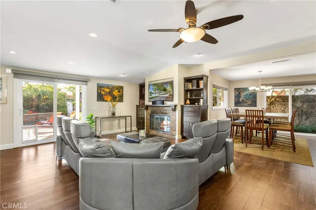Fully Renovated in 2008, this Custom Mesa Verde, Single-Story Residence is an Entertainers Dream! With 4 beds, 2 baths and 1,855 sqft. of living space on an expansive 8,280 sqft. lot, there is plenty of room to enjoy! The curb appeal is truly special with a garage reconfiguration inspiring homeowners to create a Private Courtyard Retreat filled with plush landscaping, comfortable seating, an exquisite water feature, and tastefully chosen pavers. The Ranch-Style floor plan offers a nice separation of space between bedrooms and the Living area. The open-concept design seamlessly blends the Kitchen, Living and Dining. The Chefs Kitchen is stunning! A large center island with generous bar seating, cabinets, and counter space all add to the bar sink, ice maker, wine storage, water filtration systems and built-in refrigerator. A Lennox gas fireplace, built-in cabinets, surround-sound, and dual sliding doors are pulled together by attractive porcelain tile flooring, recessed lighting, fresh interior paint, dual-pane windows and ceiling fans throughout, to create a fresh, airy flow. The Master Bedroom is bright with with side-yard access and a walk-in closet. The Master Bath presents accent wall tile, a walk-in shower, towel warmer, free-standing vanity, decorative sconce lighting and a separate lavatory. All secondary bedrooms are spacious, versatile, and offer beautiful backyard views. One bedroom is currently being used as a Home Office with a custom double-door entry and backyard slider. The Hall Bath includes a soaking tub, glass shower shield, sconce lighting and contemporary