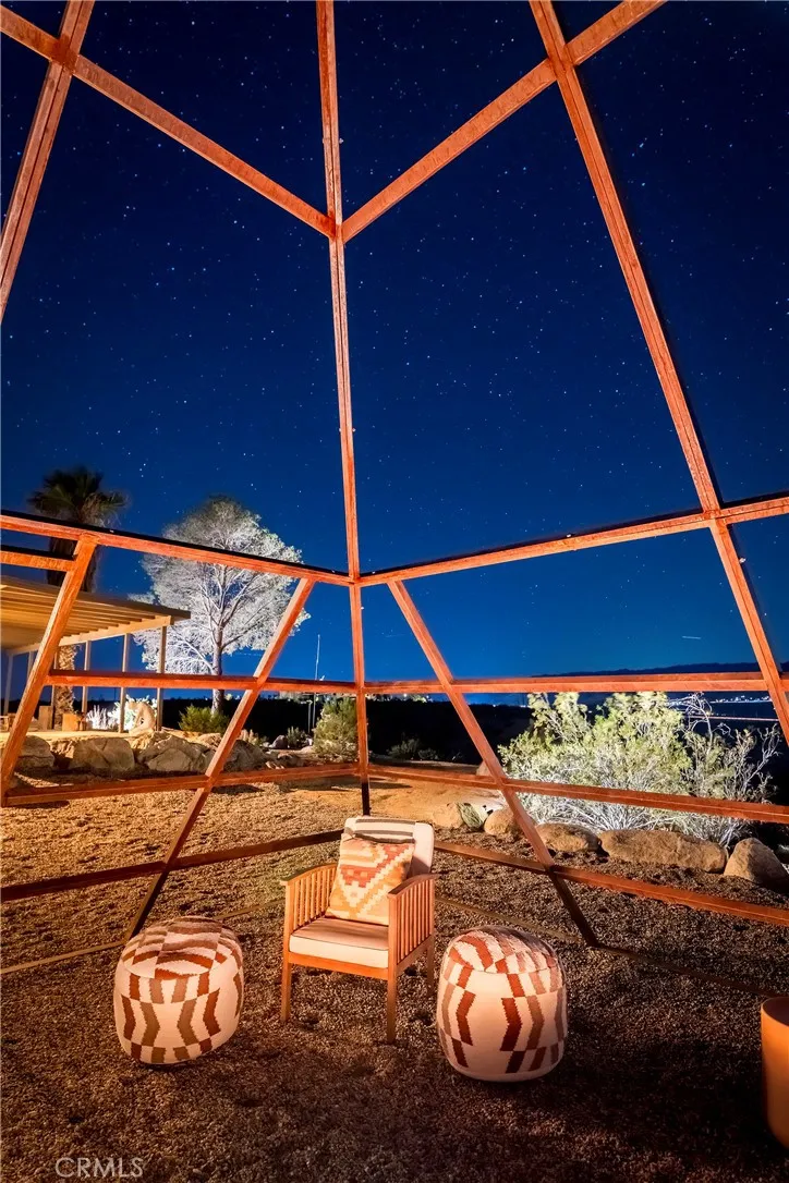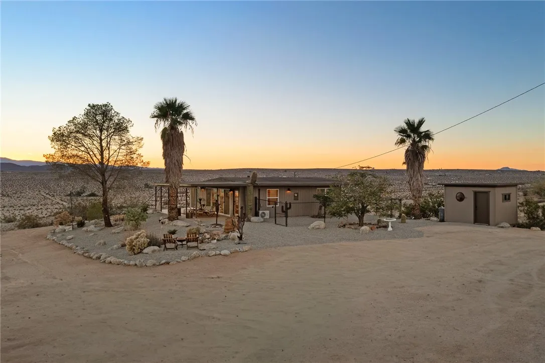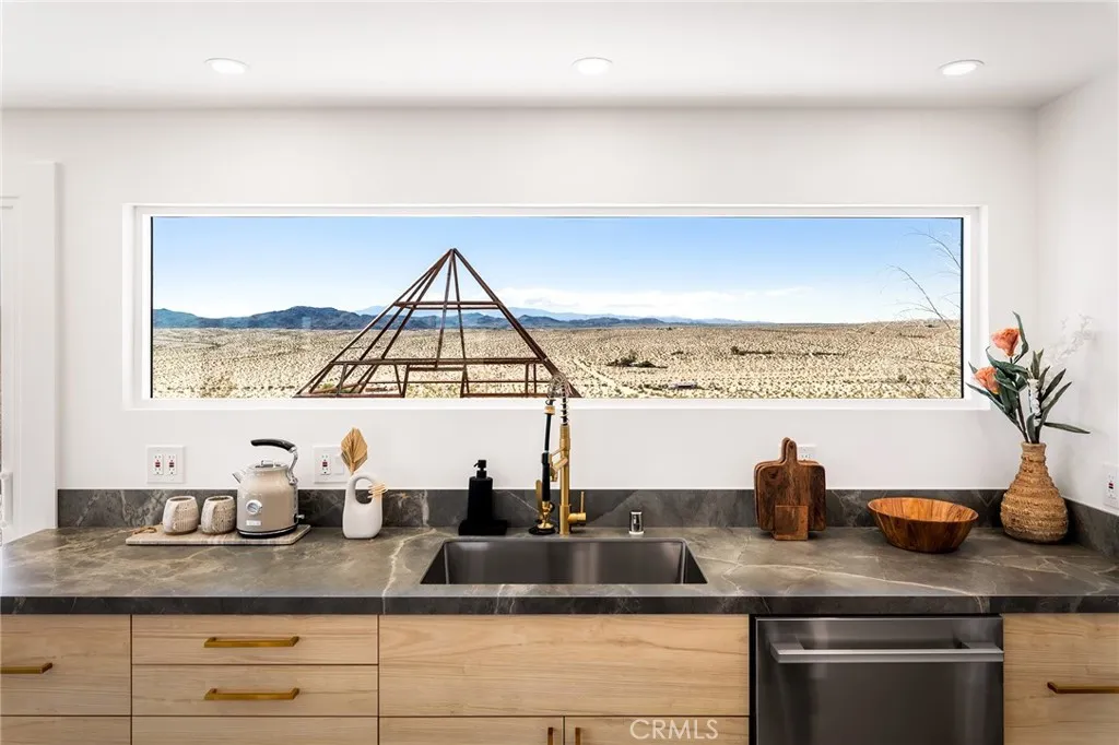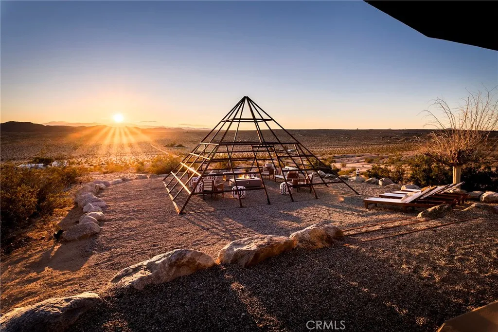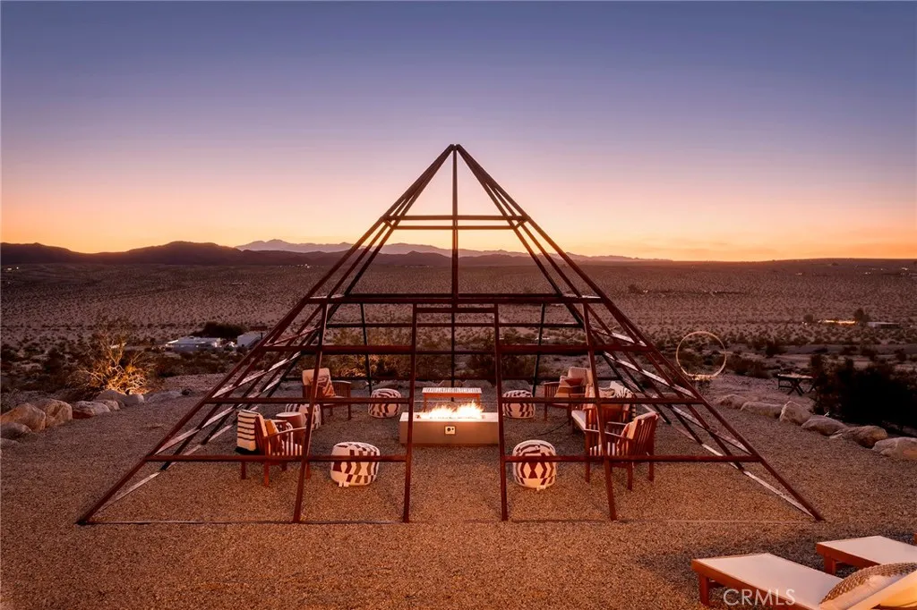 29 WEST PYRAMID HOUSE: Perched on the top of its own mountain, this striking 2-bedroom, 2-bathroom retreat delivers 360-degree views spanning Indian Cove in Joshua Tree National Park, Big Bear, and San Gregorio. Framed by dramatic imported boulders and pristine desert landscape, the property offers a rare blend of privacy, serenity, and natural beauty. At night, the dark skies transform into a stargazers dream, making this a true High Desert sanctuary. The centerpiece of the landscape is a bold steel-frame pyramid, measuring 24' x 24' x 14', positioned at the mountains edge. This dramatic outdoor structure creates a visual anchor and an unforgettable backdrop for both day and night desert living. Inside, the home is curated with Venetian plaster walls, lime wash finishes, and custom vertical plaster striping. The open floor plan is framed by expansive sliding glass doors and an 8-foot picture window, pulling the desert scenery directly into the living space. Spa-inspired bathrooms feature floating vanities, backlit mirrors, wood tile, and marble finishes, blending sophistication with soothing desert textures. A shaded porch extends from the living room, offering a peaceful vantage point for sunrise coffee or evenings under the stars. Custom channel lighting in the living room mirrors the sharp lines of the pyramid, emphasizing the interplay of geometry and desert landscape. The large kitchen showcases brand-new counters, custom cabinetry, and generous storage designed for both everyday use and stylish entertaining. Centrally located at the edge of 29 Palms and Joshua Tree,