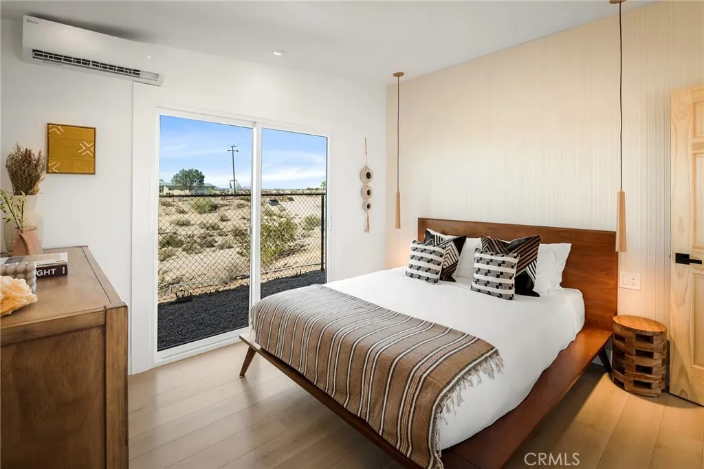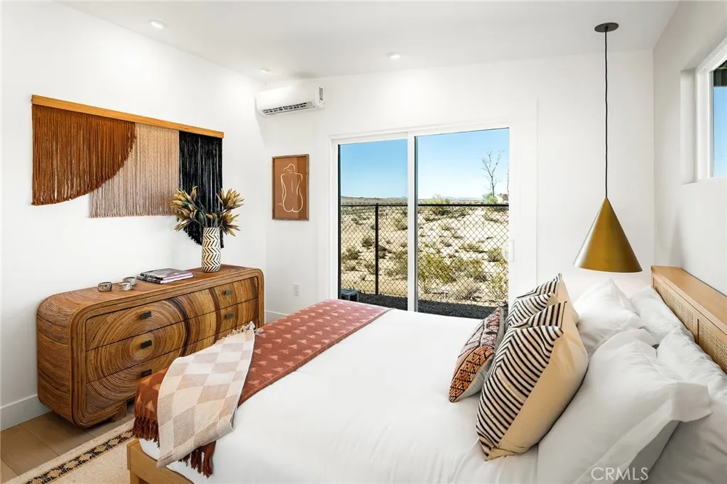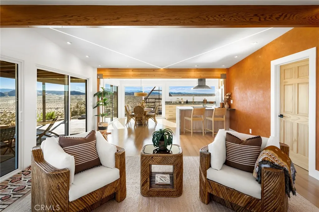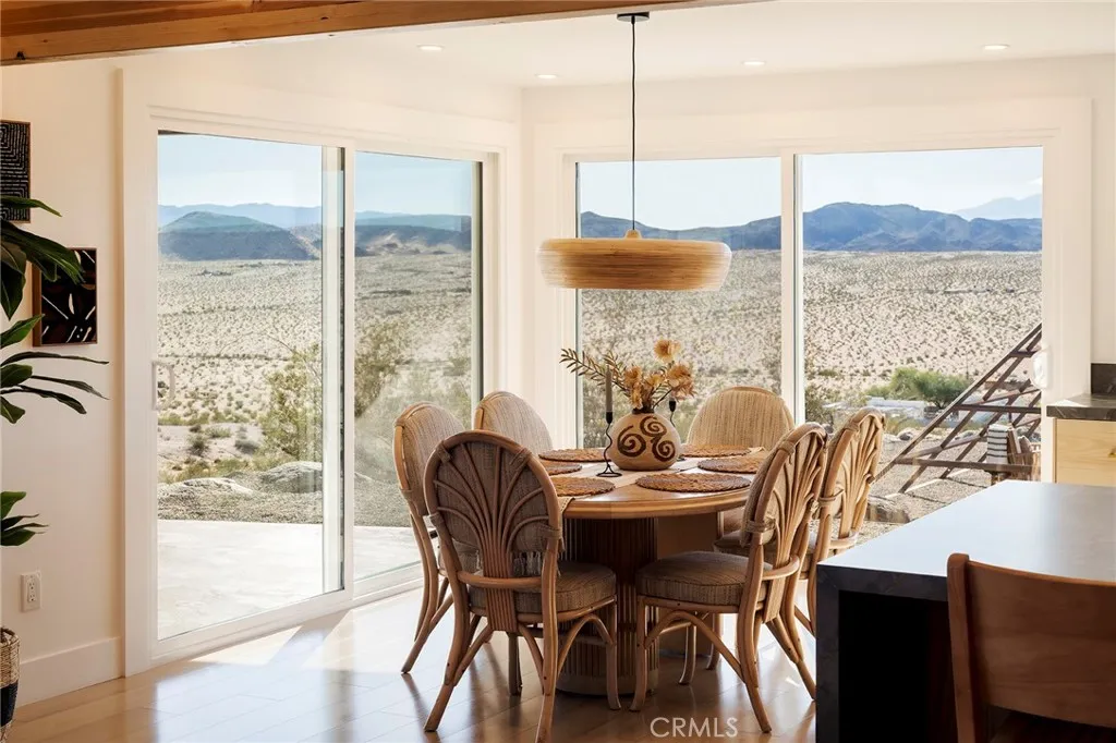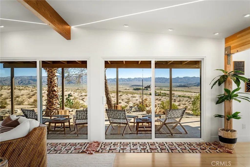 29 WEST PYRAMID HOUSE: Perched on the top of its own mountain, this striking 2-bedroom, 2-bathroom retreat delivers 360-degree views spanning Indian Cove in Joshua Tree National Park, Big Bear, and San Gregorio. Framed by dramatic imported boulders and pristine desert landscape, the property offers a rare blend of privacy, serenity, and natural beauty. At night, the dark skies transform into a stargazers dream, making this a true High Desert sanctuary. The centerpiece of the landscape is a bold steel-frame pyramid, measuring 24' x 24' x 14', positioned at the mountains edge. This dramatic outdoor structure creates a visual anchor and an unforgettable backdrop for both day and night desert living. Inside, the home is curated with Venetian plaster walls, lime wash finishes, and custom vertical plaster striping. The open floor plan is framed by expansive sliding glass doors and an 8-foot picture window, pulling the desert scenery directly into the living space. Spa-inspired bathrooms feature floating vanities, backlit mirrors, wood tile, and marble finishes, blending sophistication with soothing desert textures. A shaded porch extends from the living room, offering a peaceful vantage point for sunrise coffee or evenings under the stars. Custom channel lighting in the living room mirrors the sharp lines of the pyramid, emphasizing the interplay of geometry and desert landscape. The large kitchen showcases brand-new counters, custom cabinetry, and generous storage designed for both everyday use and stylish entertaining. Centrally located at the edge of 29 Palms and Joshua Tree,