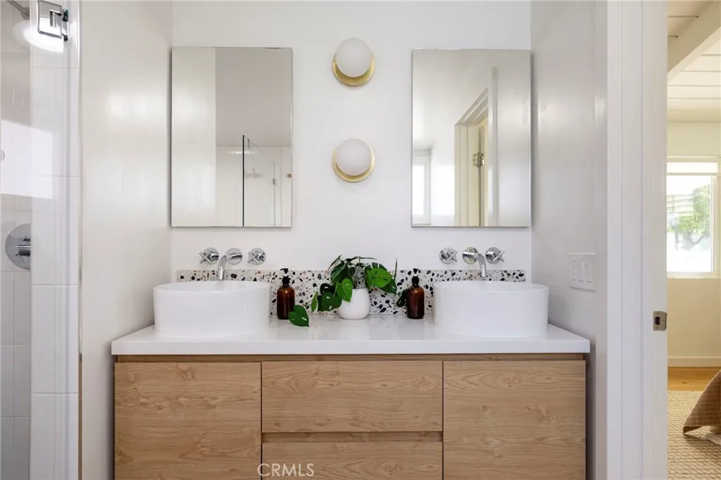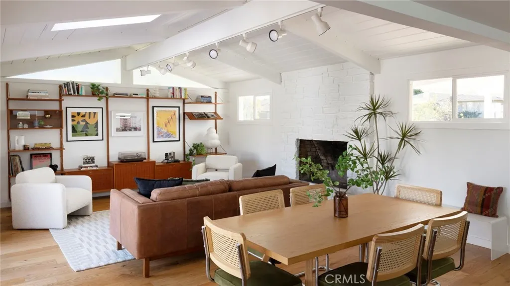 Welcome to this beautifully reimagined mid-century modern home in the heart of Bixby Knolls, where timeless architecture meets thoughtful modern upgrades. Fully renovated in 2021, this residence offers three bedrooms plus a dedicated office and two bathrooms, combining design, functionality, and effortless indoor-outdoor living. The light-filled interior showcases classic mid-century character with vaulted ceilings, exposed beams, skylights, and light tunnels that keep the home bright and airy throughout the day. The spacious living and dining areas center around a striking white brick fireplace and flow seamlessly into the remodeled kitchen, which features expansive prep space, custom cabinetry, quartz countertops, and high-end appliances designed for both everyday living and entertaining. Modern infrastructure upgrades enhance comfort and convenience, including fiber internet connectivity, integrated network wiring to the living room, a security system with cameras, and recently serviced appliances. Energy-efficient improvements include solar panels, upgraded insulation, newer windows, and central air conditioning, all installed within the past five years. The homes outdoor spaces are equally impressive, designed for both relaxation and entertaining. Enjoy evenings around the gas fire pit, unwind in the saltwater hot tub installed in 2023, or refresh in the serene outdoor shower. The low-maintenance yard features kurapia ground cover, drought-tolerant landscaping, and a WiFi-controlled irrigation system, creating a sustainable and easy-care garden. Additional highlights i