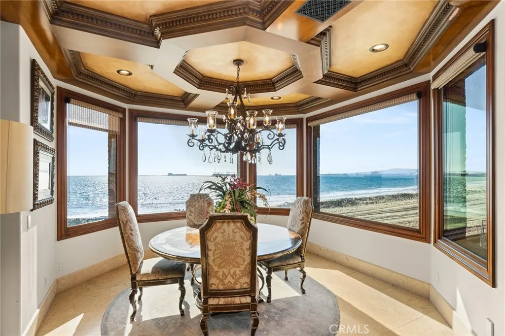 Positioned directly on the sand, this remarkable Long Beach oceanfront estate offers approximately 6,900 square feet of sophisticated coastal living across three expansive levels. Featuring 6 bedrooms and 8 bathrooms, the residence was thoughtfully designed to blend luxury, comfort, and exceptional entertaining spaces. Enjoy breathtaking panoramic views that stretch from the Pacific Ocean and Catalina Island to the Downtown Long Beach skyline, delivering unforgettable sunrises, vibrant sunsets, and sparkling city lights. A grand entry welcomes you with a dramatic wrought-iron staircase, while a private hydraulic elevator provides convenient access to all three floors. Inside, soaring wood-beamed ceilings, expansive windows, and elegant architectural details create a warm yet refined coastal ambiance filled with natural light. The chefs kitchen flows seamlessly into spacious living and entertaining areas, ideal for hosting while taking in the ocean views. The luxurious primary suite serves as a private retreat, featuring its own fireplace, spa-inspired bathroom, custom walk-in dressing room, and a private balcony overlooking the beach. Modern smart home technology allows you to control lighting, climate, audio, and security directly from your smartphone. Car enthusiasts and guests alike will appreciate the rare six-car garage, offering exceptional flexibility and storage. Extensive upgrades include new roofing, updated windows, fresh stucco, copper plumbing, tankless water heaters, acoustical flooring, onyx countertops, and travertine wood flooring throughout. Additional hig