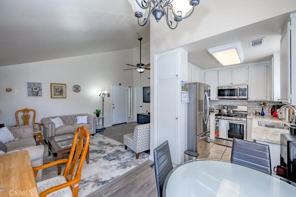Welcome to this stunning and well-maintained 3-bedroom, 2-bath home in the highly sought-after American Beauty Condos community of Canyon Country. This light-filled, open-concept home features soaring vaulted ceilings and vinyl wood flooring throughout, complemented by new blinds in every room, creating a bright, modern, and inviting atmosphere. The well-appointed kitchen features quartz countertops, ample cabinet space, and a 3-year-old refrigerator, offering a functional and stylish space for everyday living and entertaining. The living and dining areas flow seamlessly together, perfect for family gatherings or relaxing in comfort. Step outside to your private balcony for morning coffee, evening sunsets, or simply enjoying the outdoors in privacy. Additional conveniences include in-unit laundry and a detached 2-car tandem garage, providing secure parking and plenty of storage for vehicles, tools, or hobbies. The water heater was replaced a few years ago, giving added peace of mind. The American Beauty community offers a true resort-style lifestyle, with five sparkling pools, multiple spas, playgrounds, and beautifully landscaped greenbelts that create a serene, picturesque environment. The HOA covers water and trash, adding extra convenience and value. Located just minutes from parks, shopping centers, Costco, restaurants, and everyday amenities, this home also provides easy access to the 14 Freeway, making commuting a breeze. Combining style, comfort, and a highly desirable location, this home is truly a Canyon Country gem. Dont miss the opportunity to make it yours-