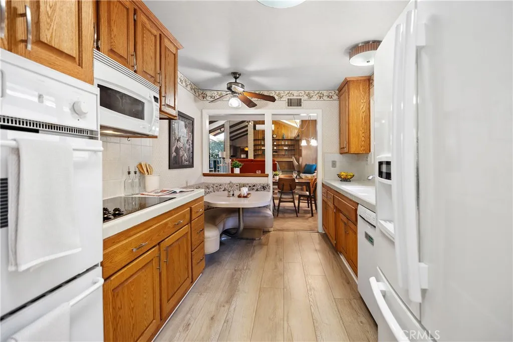 Welcome to this spacious four-bedroom, two-bathroom home designed for comfortable living. Built in highly desirable West Garden Grove as a Garden Park Estates Plan 5 home, the great room and deck were added in 1967. Set on a generous lot, this property boasts vaulted ceilings in the large great room, making it ideal for entertaining and gatherings. Step outside through sliding glass doors to a covered deck, grassy area, stylish concrete and brick patio, and a separate gazebo ready for a hot tub or extra seating. The backyard offers plenty of room for tables and chairs, allowing you to easily extend your celebrations outdoors. Enjoy the warmth of two fireplaces, built-in cabinetry with soffit lighting, and display shelving. The kitchen is equipped with a dinette, two ovens, dishwasher, cooktop, and microwave. An adjacent room, formerly the laundry space, now serves as a thoughtfully redesigned pantry. The primary bedroom offers direct bathroom access and a mini-split cooling system. Another bedroom features a convenient wall bed and sliding doors to the backyard, maximizing space and flexibility. A third includes mirrored closet doors, while the fourth has both a closet and direct garage access, plus it's attached to a bathroommaking it perfect for use as an office. Additional amenities include a two-car attached garage, solar light tube, mini-split cooling in the great room, fruit trees, completely fenced backyard, a large driveway for extra parking, an outdoor sprinkler system, motion sensor lighting, multiple storage closets/cabinets many with organizing inserts, new heat