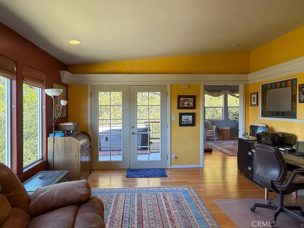 Artistic and full of character, this Pine Knolls home offers Moonstone Beach views and a uniquely creative living experience above Cambrias West Village. Perched on a generous 13,450 sq ft lot, this 2-bedroom, 2-bath home offers 1,800 sq ft of inspired coastal living, along with a rare 1,300 sq ft three-car garagean exceptional find in Cambria. Single-level living unfolds at the top of the stairs, where wood-beamed ceilings, bamboo and tile flooring, and an open-concept layout create warmth and character. The living area showcases a gas free-standing fireplace and flows into the dining space, where dramatic antique-style double doors open to a spacious bonus family roomideal for a studio, media room, or creative retreat. The kitchen includes a Viking gas range and granite breakfast bar. The primary suite is located just a few steps up from the family room and features framed Moonstone Beach views, a dedicated office area, walk-in closet, and private access to a white-water view deck with a working hot tub. A guest bedroom and full bath complete the interior living space. The oversized 1,300 sq ft three-car garage includes built-in rolling cabinetry, a single front door and a two-car rear doorideal for car enthusiasts, artists, or hobbyists. Additional features include ample off-street parking, fenced dog run, chair lift from the garage to the living level, low-maintenance landscaping and a new roof installed in 2022. Enjoy coastal wildlife and close proximity to shopping, dining, and wine tasting in Cambrias West Village.