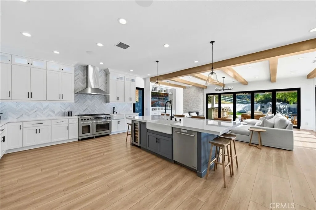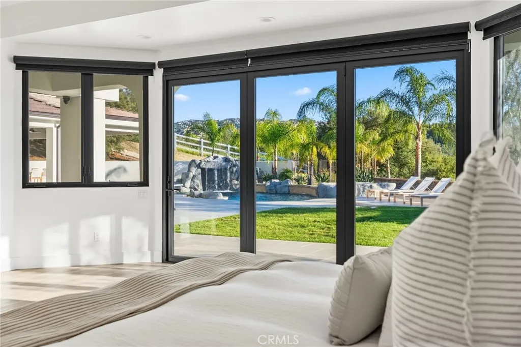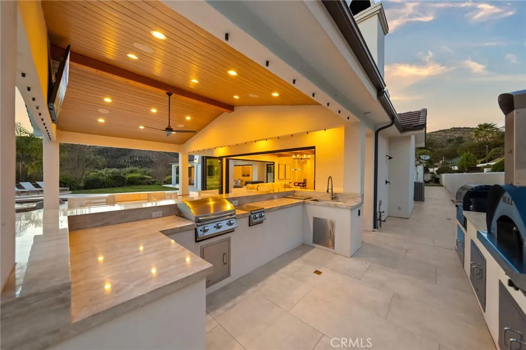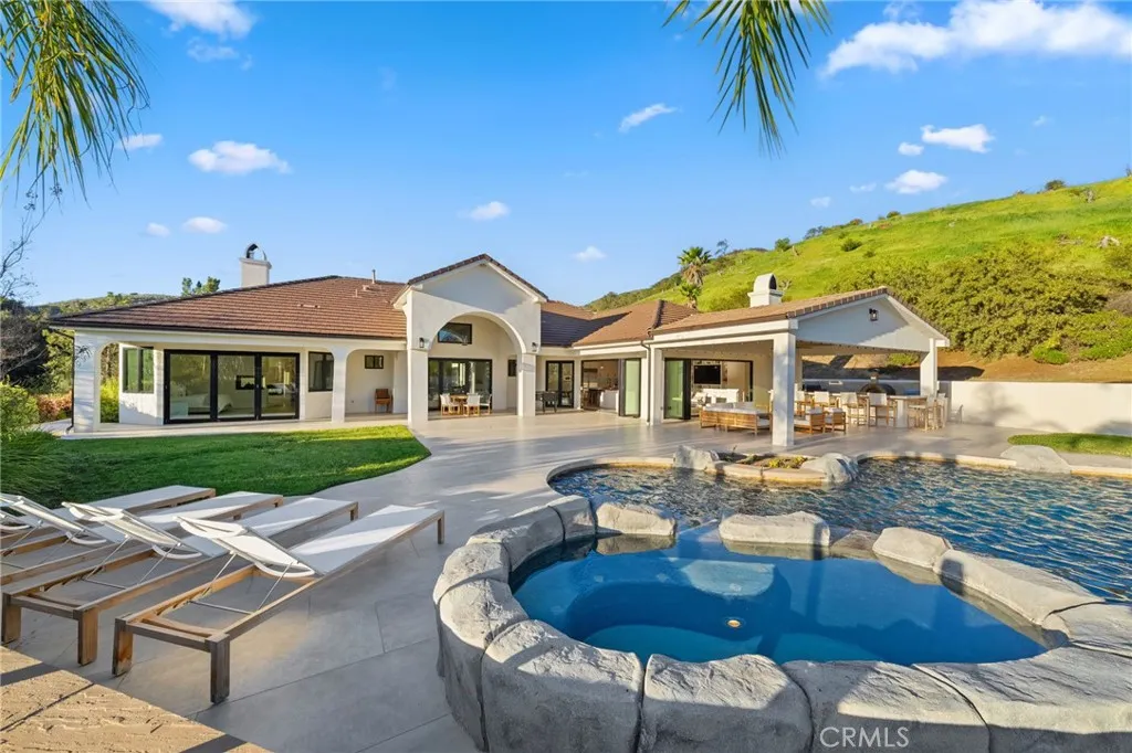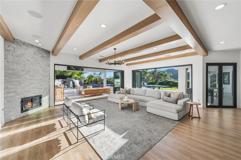 Welcome to a truly one of a kind, fully renovated single story estate, ideally situated in what is arguably one of the best locations De Luz has to offer. Perched at the top of the mountain while still just minutes from town. Set behind a private gated entrance and fully fenced for added privacy, this exceptional property combines luxury, functionality, and lifestyle in one remarkable offering. Spanning just over 4,000 square feet, the home features 4 spacious bedrooms and 4 bathrooms, including three secondary bedrooms with their own en-suite baths, each living like a private master suite, while the fourth bedroom is conveniently located across from a full bathroom. Designed with both comfort and style in mind, the home showcases high ceilings, stunning exposed beams, and an open, light filled floor plan enhanced by pocket doors in multiple rooms for seamless indoor outdoor living. The expansive kitchen is an entertainers dream, offering ample space, thoughtful design, and effortless flow into the main living areas. The primary suite is equally impressive, with pocket doors leading directly to the backyard and a beautifully appointed bathroom retreat. Set on approximately 8 acres, the property offers endless possibilities, including room to expand, private trails, and a resort style outdoor experience. Enjoy a sparkling pool and spa, a multipurpose sport court, and a covered patio featuring pitched beamed ceilings, custom tile flooring, misters, ceiling fans, built-in lighting, and multiple TVs. The outdoor kitchen is fully equipped with a built in pizza oven perfect for h