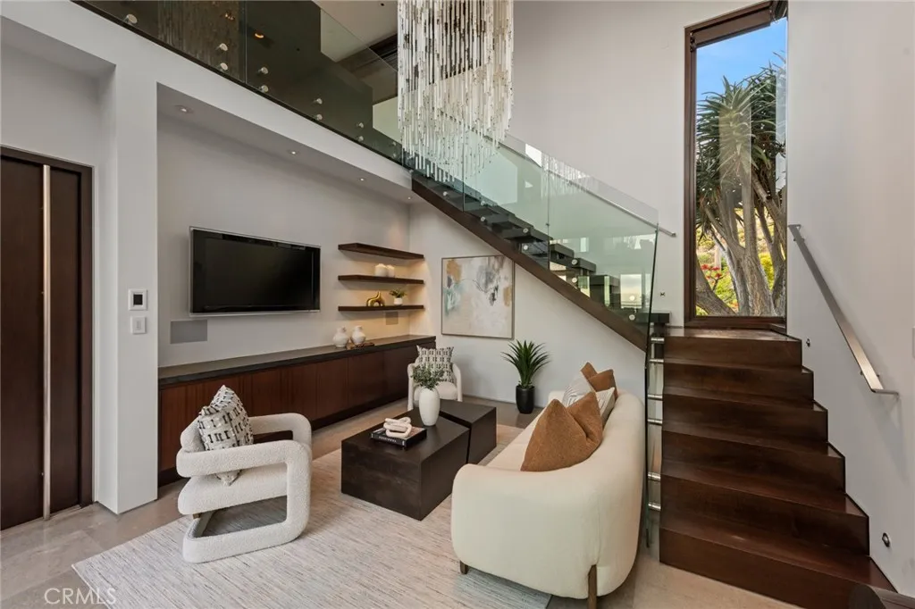 Behind the exclusive guard-gated enclave of The Strand at Headlands, this alluring contemporary residence epitomizes the pinnacle of luxury beachside living. Conceived by renowned architect, Horst Noppenberger, this property was custom built and tailored to enjoy the most awe-inspiring panoramic ocean and Catalina views. Spanning over 6,300 square feet of interior space, steel frames allow for fewer walls and large floor to ceiling windows, embracing an open-concept layout throughout. Upon entering, you are greeted by a dramatic entrance of stone walls and an alluring courtyard of ponds and fountains that overflow into the backyard pool and spa. With ample space across three levels, this home boasts 2 primary suites, 4 guest bedrooms, including an office equipped with a Murphy bed, and a secondary living room with its own private entrance. The gourmet kitchen offers minimalist features of sleek cabinetry, dual sinks, and butler's pantry of two Bosch dishwashers, 3 Sub Zero refrigerators, Wolf ovens, 2 wine refrigerators, and a generous size island for entertaining. Adjacent to the kitchen is the living room and dining room, which are complemented by the stone fireplace, neutral tones, and glass sliding doors that open up to the expansive deck overlooking the backyard, built-in BBQ, and several other seating areas to take in the mesmerizing sunsets. The exquisite primary suite showcases the most splendid views in the house, boasting a generous wrap-around deck complete with an outdoor fireplace. Moreover, it offers convenient amenities such as a mini bar featuring a sink and