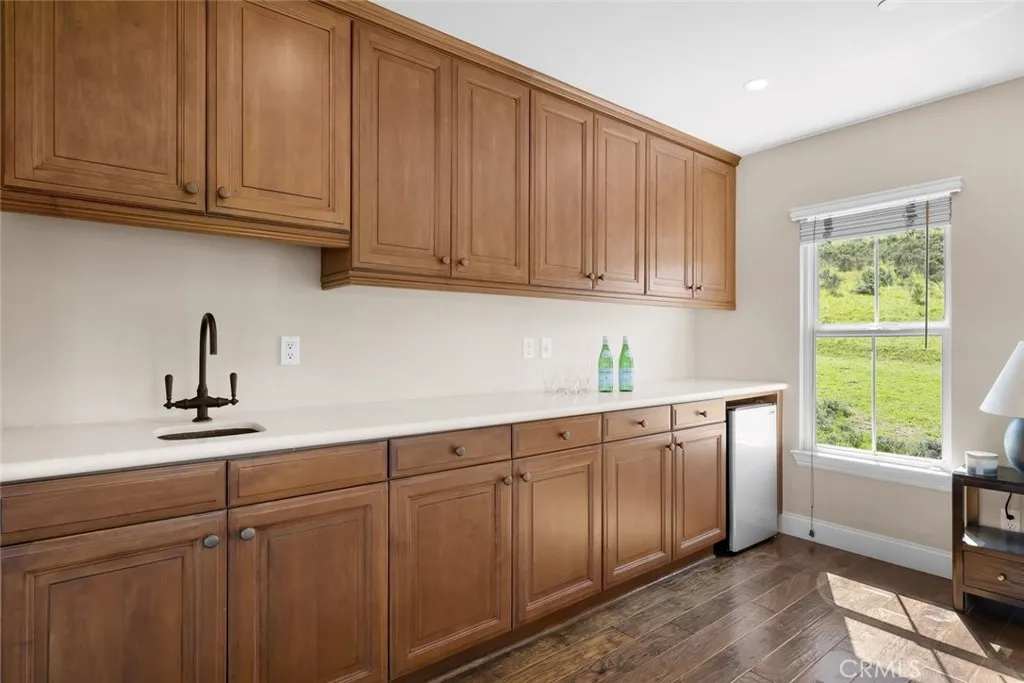 Set within the coveted Valle Vista Ranch community, this extraordinary Mediterranean-style estate captures the essence of Central Coast living with sweeping, cinematic views of Bishop Peak, Cerro San Luis, and the rolling hills that define San Luis Obispo. From the moment you arrive, the beautifully landscaped approach, lush lawns, and charming portico set a tone of timeless elegance, welcoming you into a residence where every detail has been thoughtfully curated. The grand foyer opens to a stunning office space with soaring ceilings and picturesque vistas. Designed for both refined entertaining and everyday comfort, the home features rich hickory wood and tile flooring throughout. A formal dining room, illuminated by a striking chandelier, is complemented by a stylish dry bar with wine storage and positioned perfectly to take in patio access and breathtaking views. The living room blends warmth and grandeur with a cozy fireplace and seamless connection to the expansive kitchen with abundant cabinetry, a spacious center island, stainless steel appliances, and a walk-in pantry create a true culinary haven. Luxury continues with four spacious bedrooms, each with its own ensuite bath. The downstairs primary suite is serene, featuring French doors to a private stone patio, a spa-inspired bath with a jetted soaking tub, dual vanities, dedicated makeup counter, walk-in tile shower, private water closet, and generous walk-in closet. Additional accommodations are equally impressive. One bedroom boasts its own sitting room with a dry bar, microwave, and refrigerator, while another o