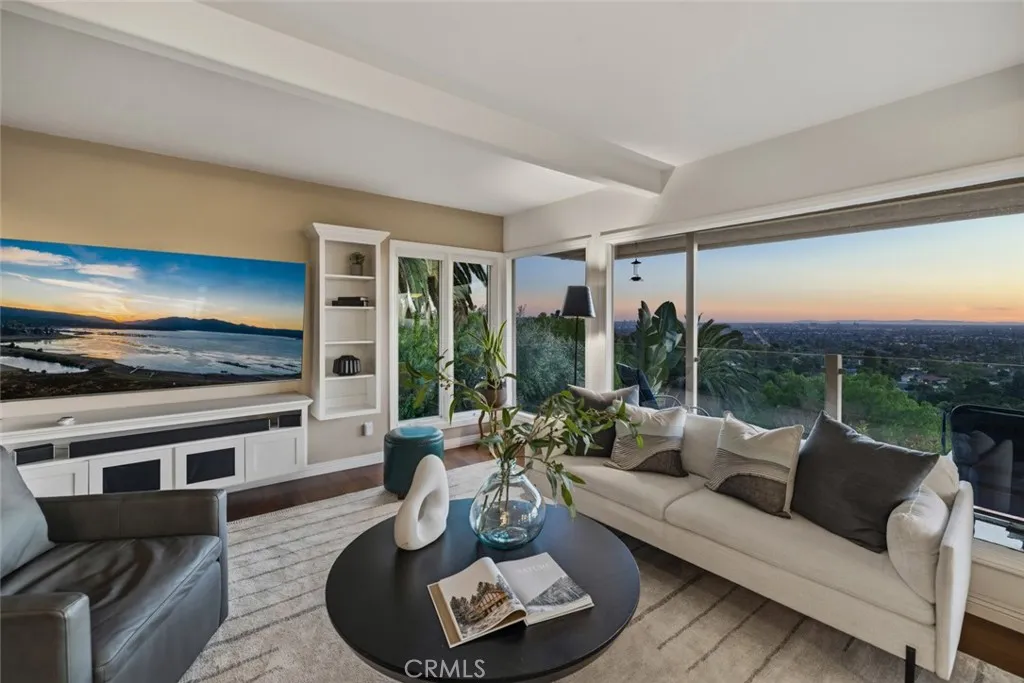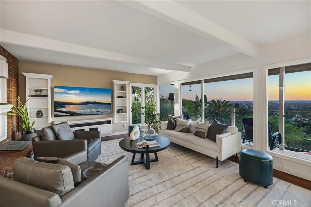 This is one of the most incredible view properties to ever come onto the market in North Tustin. If you don't believe us, come see it for yourself. This exceptional 3-bedroom, 3-bathroom, 2,075 sqft residence sits on a terraced 15,000-square-foot lot. What sets it apart is the unrivaled panoramic view that stretches from Catalina Island across Orange County and into Los Angeles County. On clear days the view becomes a living masterpiece: beginning at Newport Coast, your gaze sweeps northward to Fashion Islands gleaming towers, John Wayne Airport, Huntington Beachs smokestacks, the harbors of Long Beach and San Pedro, Angel Stadium, the Honda Center, the nightly sparkle of Disneyland fireworks, the glittering Downtown Los Angeles skyline, and finally the legendary Hollywood Sign, all framed by Catalina, Palos Verdes, and the Pacific Ocean. This is far more than sceneryit is an ever-evolving, breathing canvas of Southern Californias most iconic landmarks, visible 24/7/365. This home is oriented to capture this panorama from nearly every main-floor room. The open living room, dining area, chefs kitchen, and primary suite all feature unobstructed views through oversized windows and sliding doors. The remodeled kitchen has rich double-thick granite countertops, a Wolf 6-burner range, Sub-Zero refrigerator, wine fridge, designer cabinetry, and engineered Koa hardwood floors flowing throughout. The living room lets you lounge while gazing at the horizon beyond the glass wall. The master bedroom offers a walk-in closet and a beautiful master bath featuring a luxury shower with doub