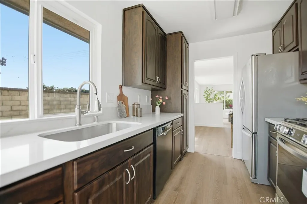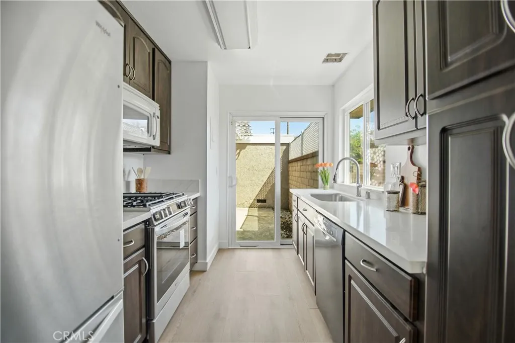 This completely remodeled, turnkey 2-bedroom, 1-bathroom corner townhome delivers 912 sq ft of modern, low-maintenance living with the two most sought-after features in Lake Forest: a private attached 2-car garage plus one additional assigned parking space giving you three total parking spots right at your door. As a true corner unit with only one shared wall, this home feels more like a detached single-family residence than a typical attached townhome delivering exceptional privacy, extra light, and a spacious open feel that sets it apart from every other unit in the complex. The ultra-low HOA of just $350/month is the lowest in all of Lake Forest, keeping your monthly costs minimal while the association handles exterior maintenance. This combination of private 2-car attached garage, extra parking, corner-unit privacy, and rock-bottom HOA is genuinely rare and almost impossible to find at this price point. Inside, every detail has been upgraded to todays standards. The bright galley kitchen features sleek dark wood cabinetry, crisp white quartz countertops, stainless-steel appliances (gas range, oven, dishwasher, refrigerator), built-in microwave, and durable wood-look flooring. Recessed lighting, neutral finishes, and an updated bathroom complete the move-in-ready interior. A sliding glass door opens to your private fenced patio perfect for morning coffee or evening unwinding. This fully remodeled corner townhome is located in a prime Lake Forest neighborhood, just minutes from shopping, dining, parks, top-rated schools, and easy access to the 5, 405, and 133 freeways.