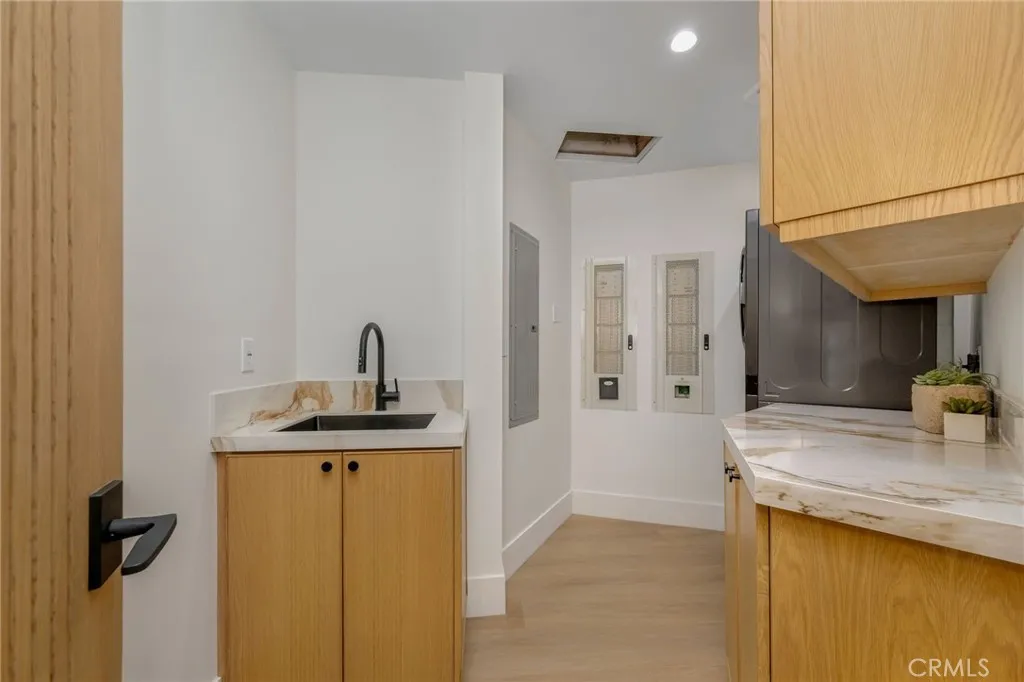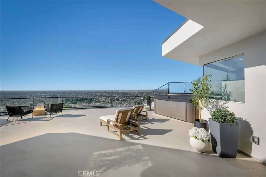 Welcome to The Halo House a one-of-a-kind trophy estate perched in the coveted hills of North Tustin, California, where 180 panoramic views stretch from Catalina Island across the Long Beach Port to the Downtown Los Angeles skyline. Enjoy nightly Disneyland fireworks, best experienced from your private hot tub under the stars. The main living level is designed for elevated everyday living and entertaining. The chefs kitchen features white oak cabinetry, quartzite waterfall countertops, full backsplash, and a complete JennAir appliance suite, plus a workstation sink. A hidden butlers pantry offers a second dishwasher, wall oven, steam oven, microwave, beverage fridge, and abundant storageideal for hosting. Walls of glass open to a view deck, creating seamless indoor-outdoor living with dramatic scenery as your backdrop. The primary suite occupies its own private level, delivering a true resort experience. Step onto a 1,200-sq-ft view deck with spa-style hot tub, travertine firepit, and lounge areas overlooking ocean, city, and sunset views. Inside, the suite includes floor-to-ceiling sliding glass doors, a dedicated office, and a spa-inspired bath with dual vanities, heated floors, and a freestanding soaking tub. The custom walk-in closet features its own washer/dryer combo and LG clothing steamer. A coffee bar and beverage fridge complete this exceptional retreat. The lower level is an entertainers dream, anchored by a full custom bar with fluted walnut cabinetry, dramatic black quartzite countertops, ice maker, dishwasher, fridge, and restaurant-style sink trough with gla