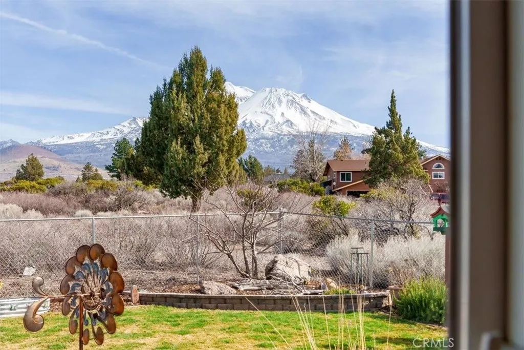 MOUNTAIN VIEW RETREAT IN LAKE SHASTINA NEW ROOF & EXTRA LOT INCLUDED! Enjoy breathtaking views of Mt. Shasta, the Eddies, and surrounding mountains from this beautifully maintained 3-bedroom, 2-bath home offering 1,576 sq ft on nearly half an acre (.47 acres). With great curb appeal, thoughtful landscaping, and an additional lot included, this property offers style, privacy, and space on a quiet, lightly traveled road in Lake Shastina. Step inside to an open-concept great room with vaulted ceilings and a stunning picture window wall framing Mt. Shasta. A cozy pellet stove anchors the living space, while sliding doors lead out to the large wrap-around deck and fenced yardperfect for taking in the panoramic mountain views or watching children and pets play. The kitchen features stainless steel appliances, custom oak cabinetry, solid surface countertops, and even more beautiful mountain views. The spacious primary suite offers direct deck access through a sliding door, a walk-in closet, and a luxurious ensuite bath with Italian tile surrounding the jetted tub plus a separate walk-in shower. Outside, enjoy established landscaping with lilac, lavender, and rosemary, a lush lawn with automatic sprinklers, and charming stepping stone pathways. Additional highlights include: Brand new roof and gutters Pellet stove plus central heat and A/C Large wrap-around view deck Fenced yard Additional lot included for extra privacy Peaceful setting with very few nearby neighbors This is a rare opportunity to own a view property in Lake Shastina that combines comfort, privacy, and unforg