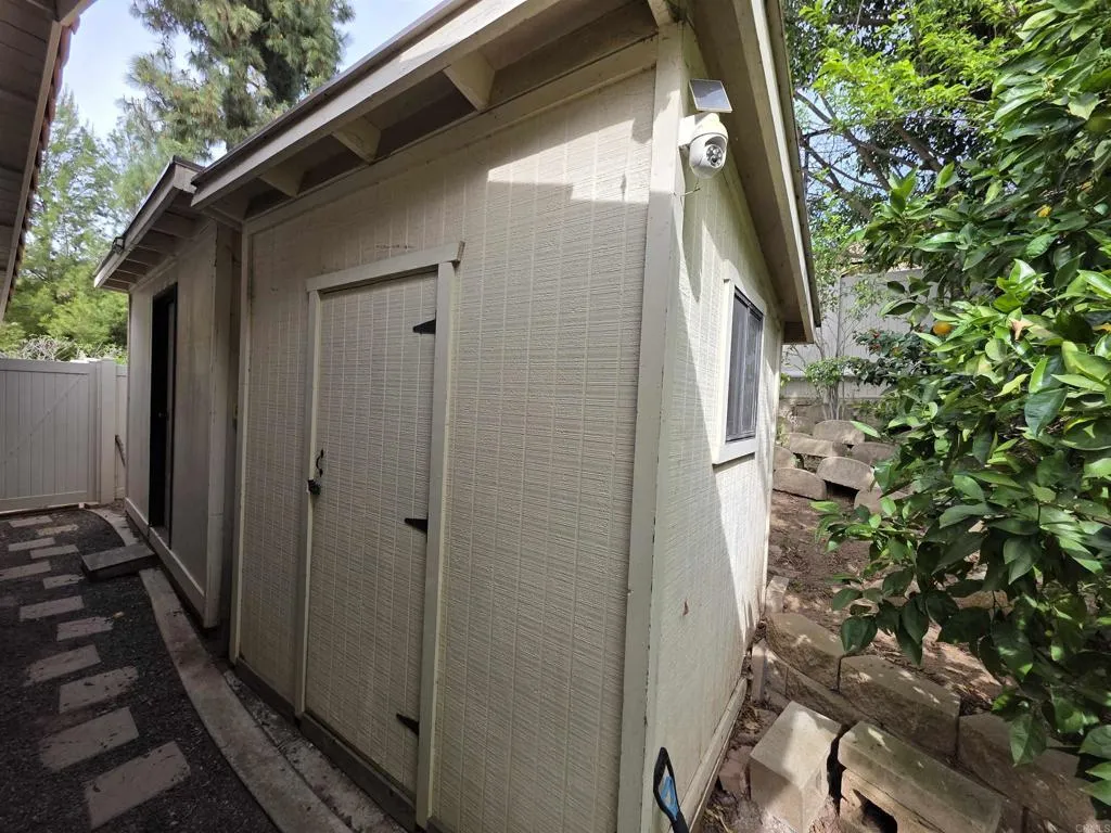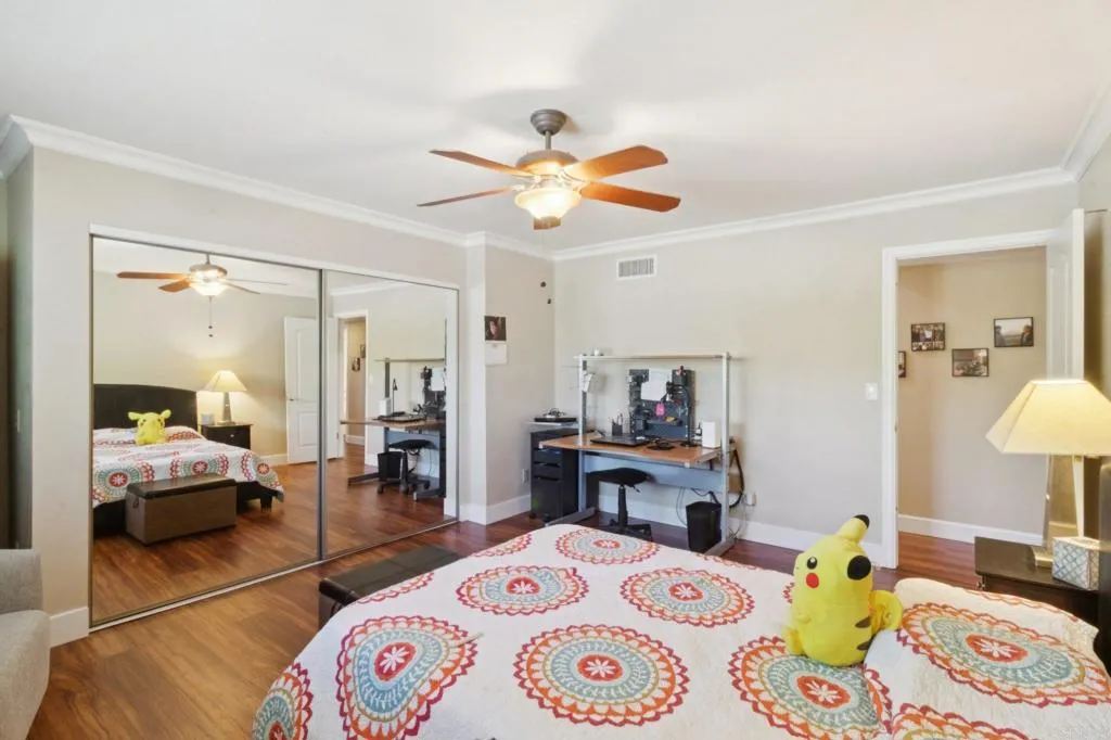 Welcome to Hidden Mesa Estates, where this beautifully maintained single-story, 4-bed, 3.5-bath, 3,292 sq ft home sits on an expansive 0.84-acre lot on a quiet and private cul-de-sac street, offering PAID solar, dual AC units, dual water heaters, full security with cameras, abundant storage, and resort-style outdoor living. As you arrive, a grand porte-cochre entrance welcomes you, supported by stone pillars and surrounded by lush landscaping, tropical foliage, and a tranquil pond that sets a serene tone before you even step inside. Double doors open into a bright, inviting interior featuring custom flooring and recessed lighting throughout, creating a warm, modern ambiance. Straight ahead, a dramatic double-sided stone fireplace anchors both the formal living room and the family room, serving as a stunning architectural centerpiece. To the right, the formal living room offers elegant seating and natural light. To the left, the family room provides a comfortable everyday gathering space with a TV area and a wet bar with wine fridge, flowing seamlessly into the kitchen. The chefs kitchen features rich wood cabinetry, granite countertops, a five-burner cooktop, built-in ovens, pantry, and a breakfast nook overlooking the backyard. The open layout connects effortlessly to the family room and dining areas, making the home ideal for entertaining. A conveniently located half bath serves the main living areas, along with a nearby guest bathroom featuring a walk-in shower. Privately positioned on its own side of the home, the spacious primary suite offers direct patio access and a