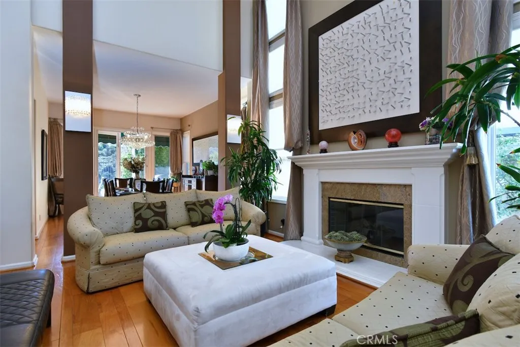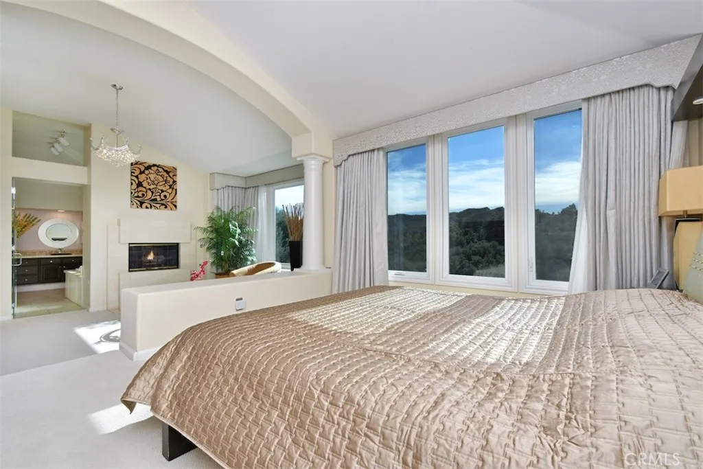Located in the prestigious Bellagio Community, this elegant Mediterranean estate showcases exceptional design, privacy, and sweeping views. Offering approximately 3,560 square feet of light-filled living space, this residence presents a rare opportunity within one of Calabasas most coveted communities. The home features five bedrooms and four baths, including a highly desirable main-level bedroom with a full bathroomideal for guests, multigenerational living, or a private home office. An expansive open floor plan is highlighted by soaring two-story ceilings, abundant natural light, recessed LED lighting throughout, and multiple fireplaces. Formal living and dining rooms flow seamlessly into a chefs kitchen, complete with an eat-in island, breakfast nook, wet bar, and extensive custom cabinetry with built-in desks and designer storage. The luxurious primary suite is a true retreat, offering mountain and countryside views, a custom bed frame, a double-sided fireplace, and a spa-inspired bathroom with a jacuzzi tub and adjoining steam bath/sauna. A spacious laundry room and beautifully appointed secondary bedrooms complete the interior. Recent upgrades include a tankless water heater, Tesla charger, solar system with 36 panels, Milgard fiberglass windows in select bedrooms, a Flume water-leak detection system, Rachio smart sprinkler timer, and updated window treatments throughout most of the home. The private resort-style grounds are equally impressive, featuring lush landscaping, stone patios, a tranquil outdoor waterfall, an in-ground heated spa, and a built-in BBQperfect fo